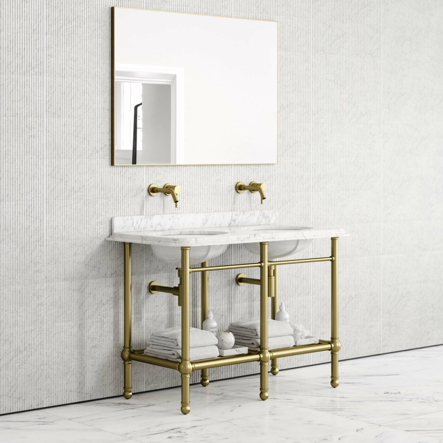 The freestanding vanity unit is finished with a luxuriously honed marble top, crafted from the Italian Carrara marble, which surrounds double built-in basins, ideal for couples or family bathrooms.