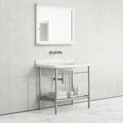 Beautifully elegant and exclusive to Lusso, the vanity unit takes inspiration from the iconic Art Deco movement, featuring geometric shaping, honed cove ogee edging and a radiant polished nickel frame, designed to work excellently with other polished nickel pieces from our Deco collection, including taps, accessories and showers.