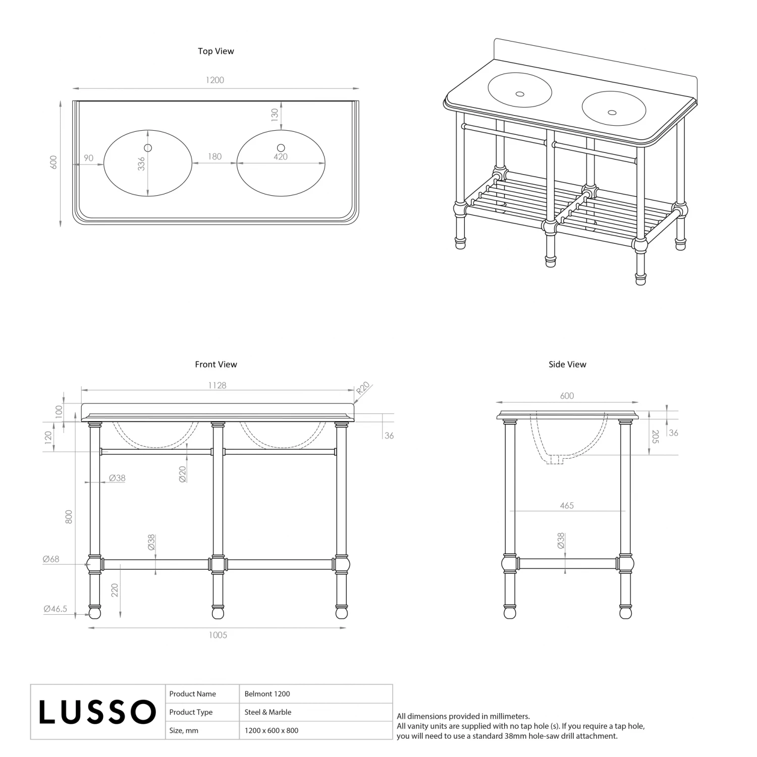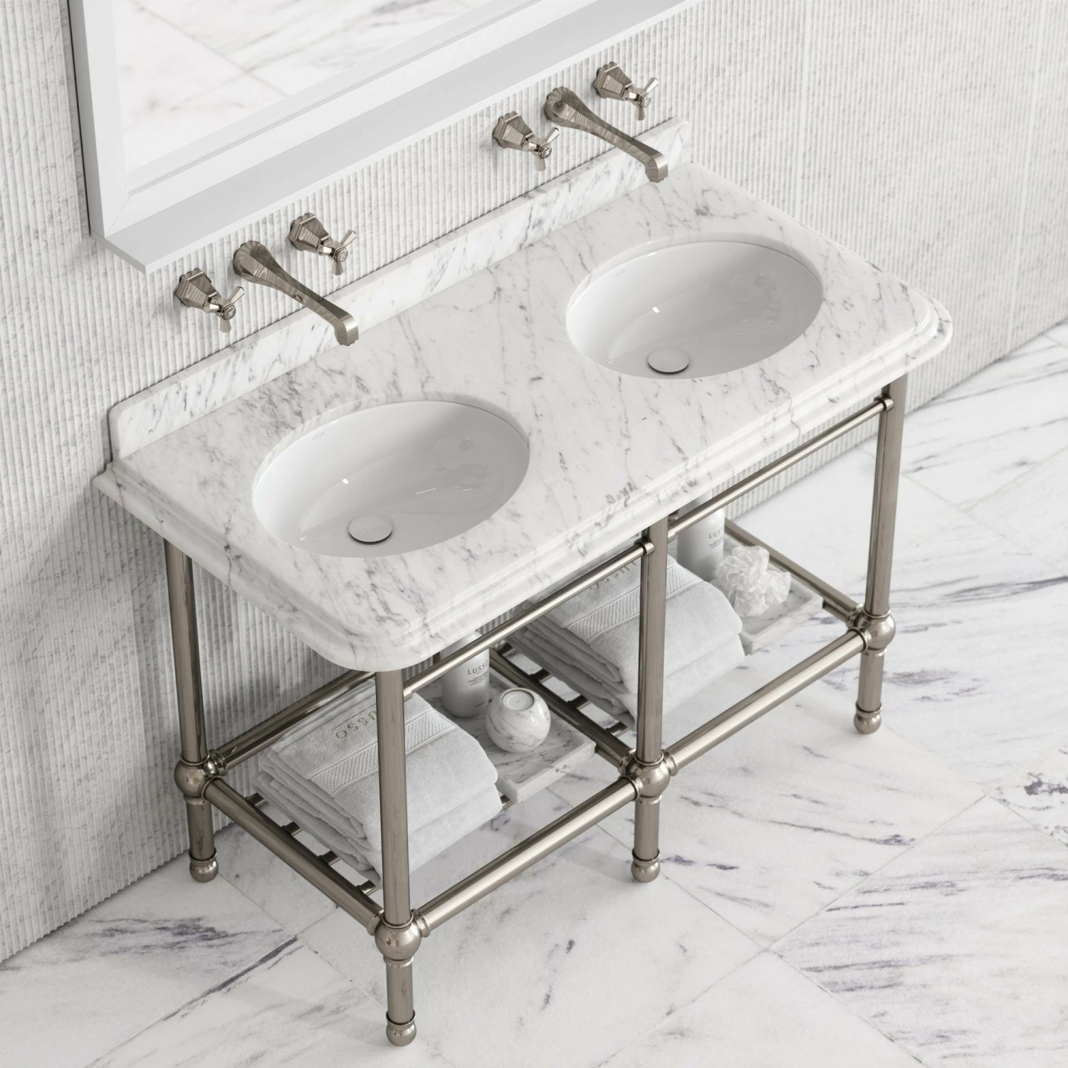 Defined by striking framework, a Carrara marble countertop and a practical double ceramic basin feature, the freestanding vanity unit can be installed within couples’ or family bathrooms and contains a functional undershelf for storing your Lusso towels.