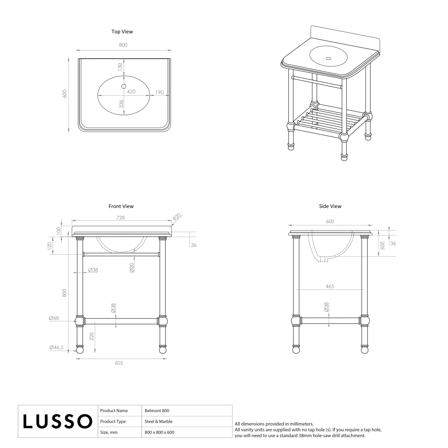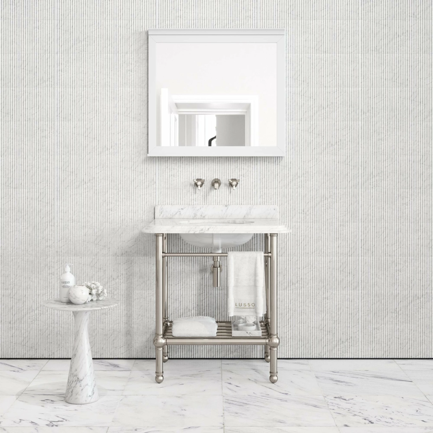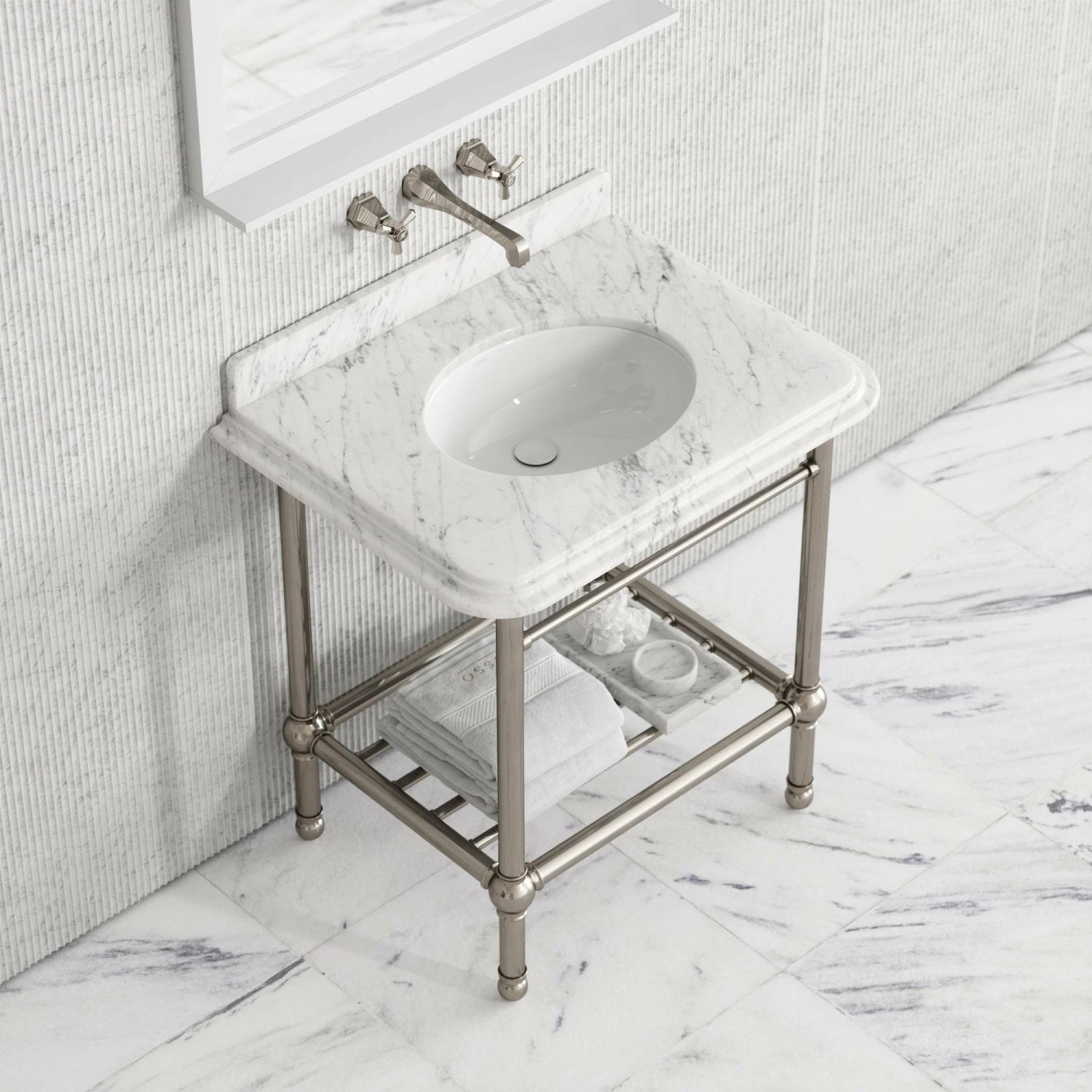 The vanity unit boasts geometric shaping and cove ogee bevelling to the luxurious Carrara marble top, finished with a built-in ceramic basin and under shelf for neat towel storage.
