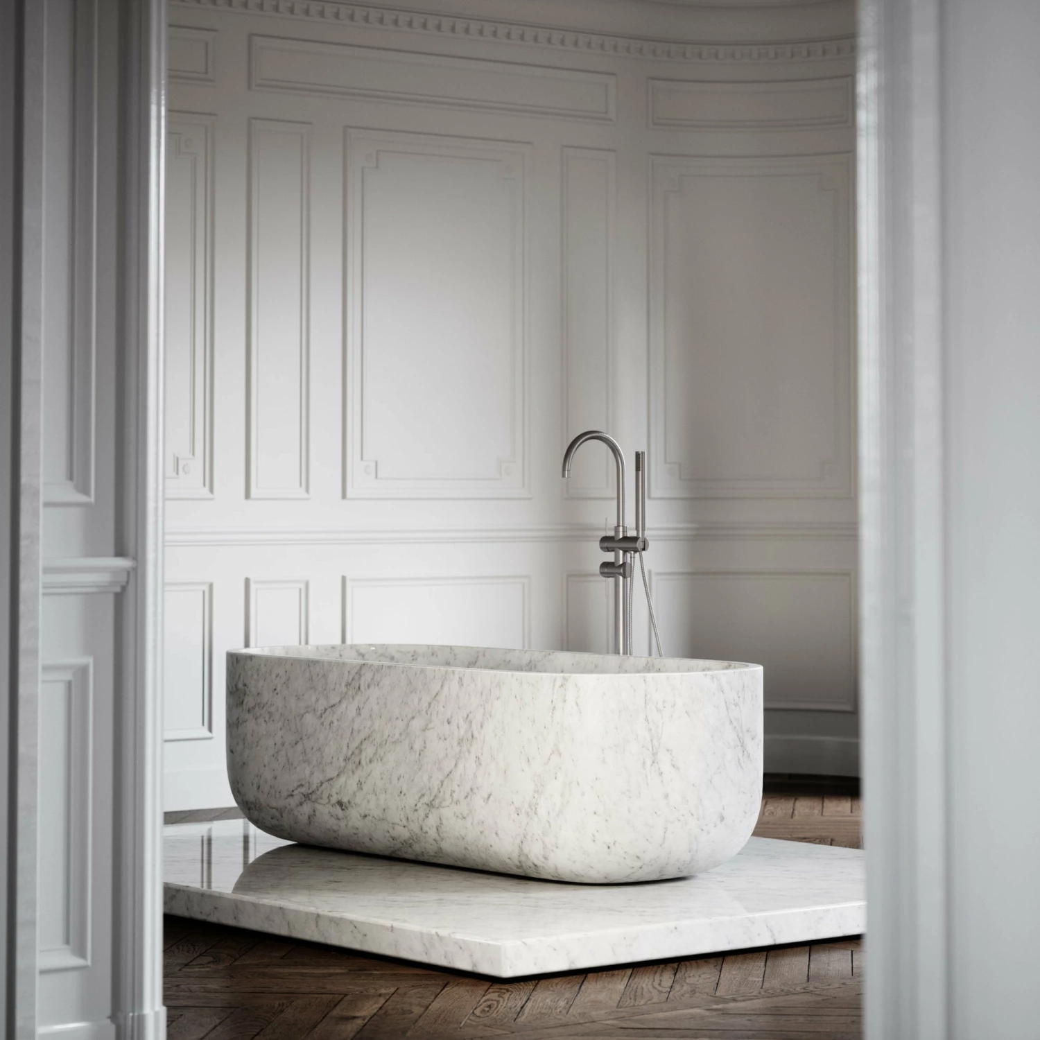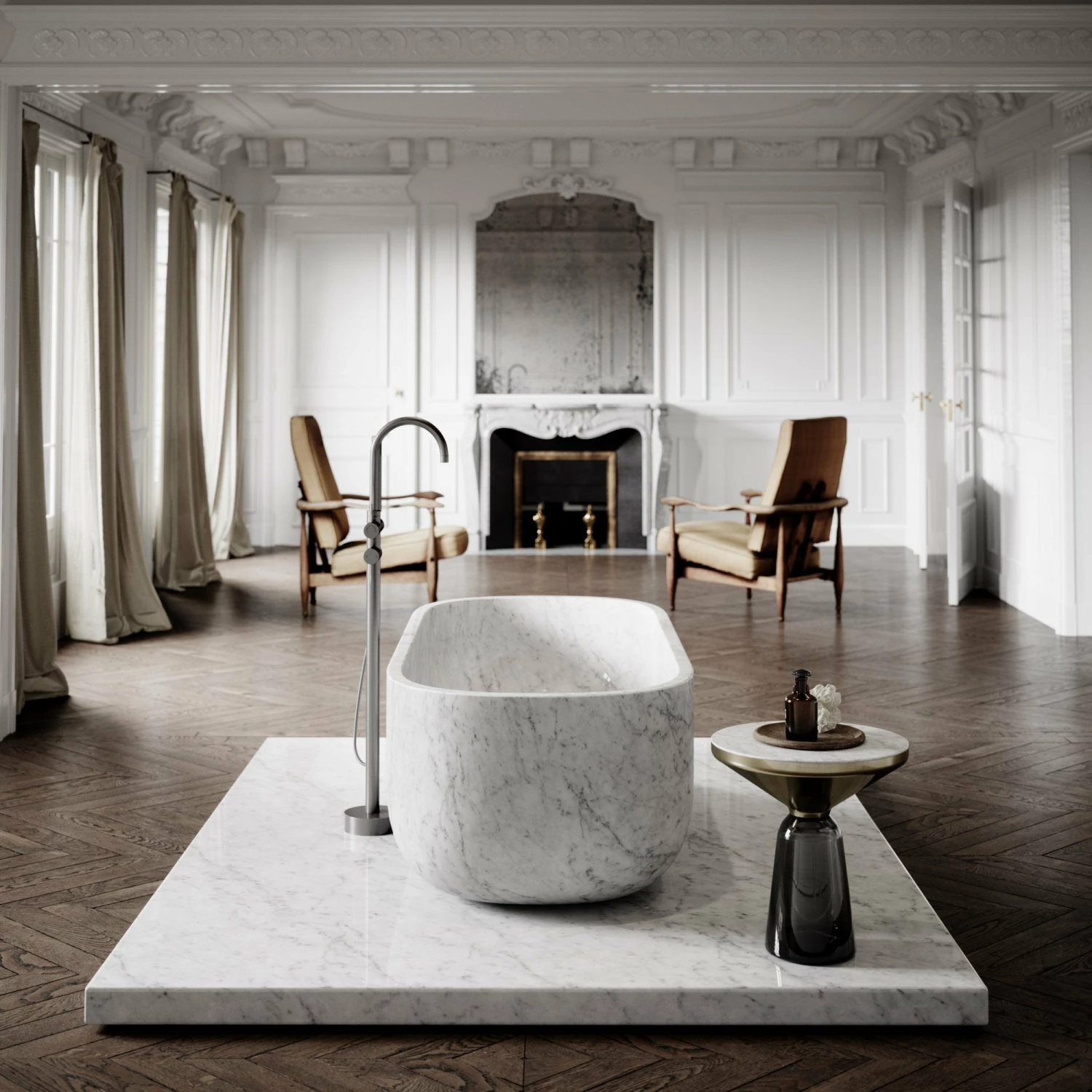 Transform your space with the magnificence of sculpted Carrara marble. Charismatic and full of ambience, this bath is all about inviting the extraordinary and immersing yourself in pure ageless luxury.