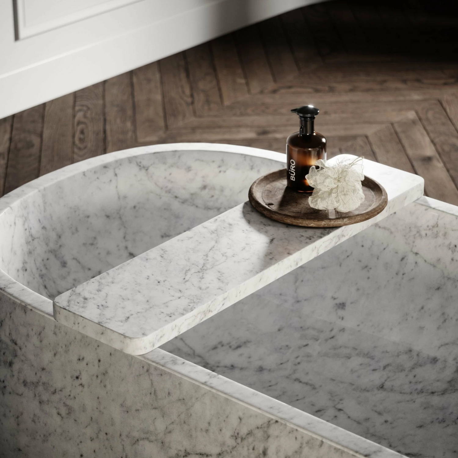 Celebrating a classic material quarried from the Alps of Italy, each piece is charmingly embellished with intricate pearl-grey veins. Externally the Carrara marble stone bath is honed, leaving the surface smooth, flat and consistent, whilst within its interior the marble is highly polished for ease of cleaning. Individually hand-finished from solid Carrara, soft to the touch, yet impressively robust ensuring its durability through everyday wear.