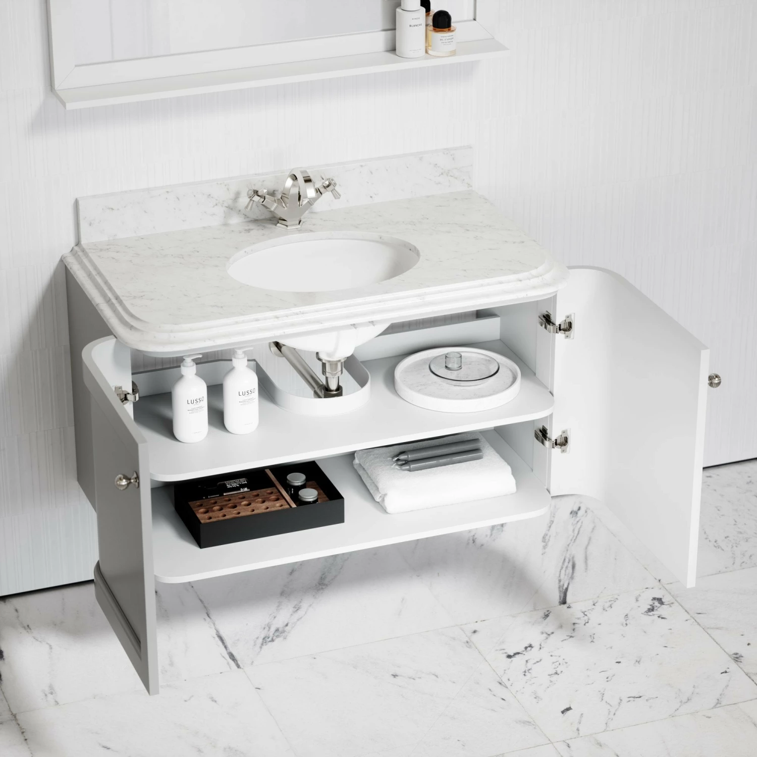 The Charsley Vanity Unit is defined by its glamorous, elegant appearance. Featuring a smooth countertop carved from Italian Carrara marble in a polished finish, alongside a built-in oval basin, the wooden vanity unit is a seamless contrast between modern and traditional design, finished with cove ogee bevelled edges.