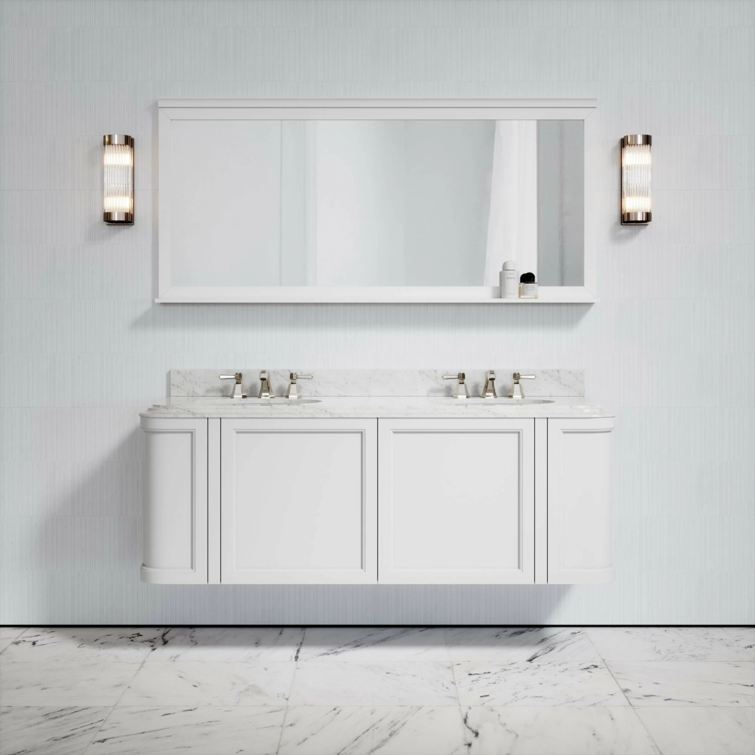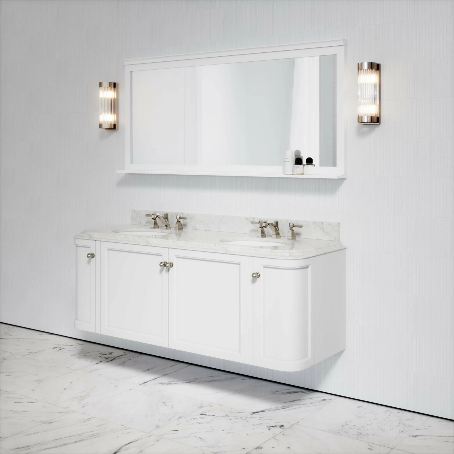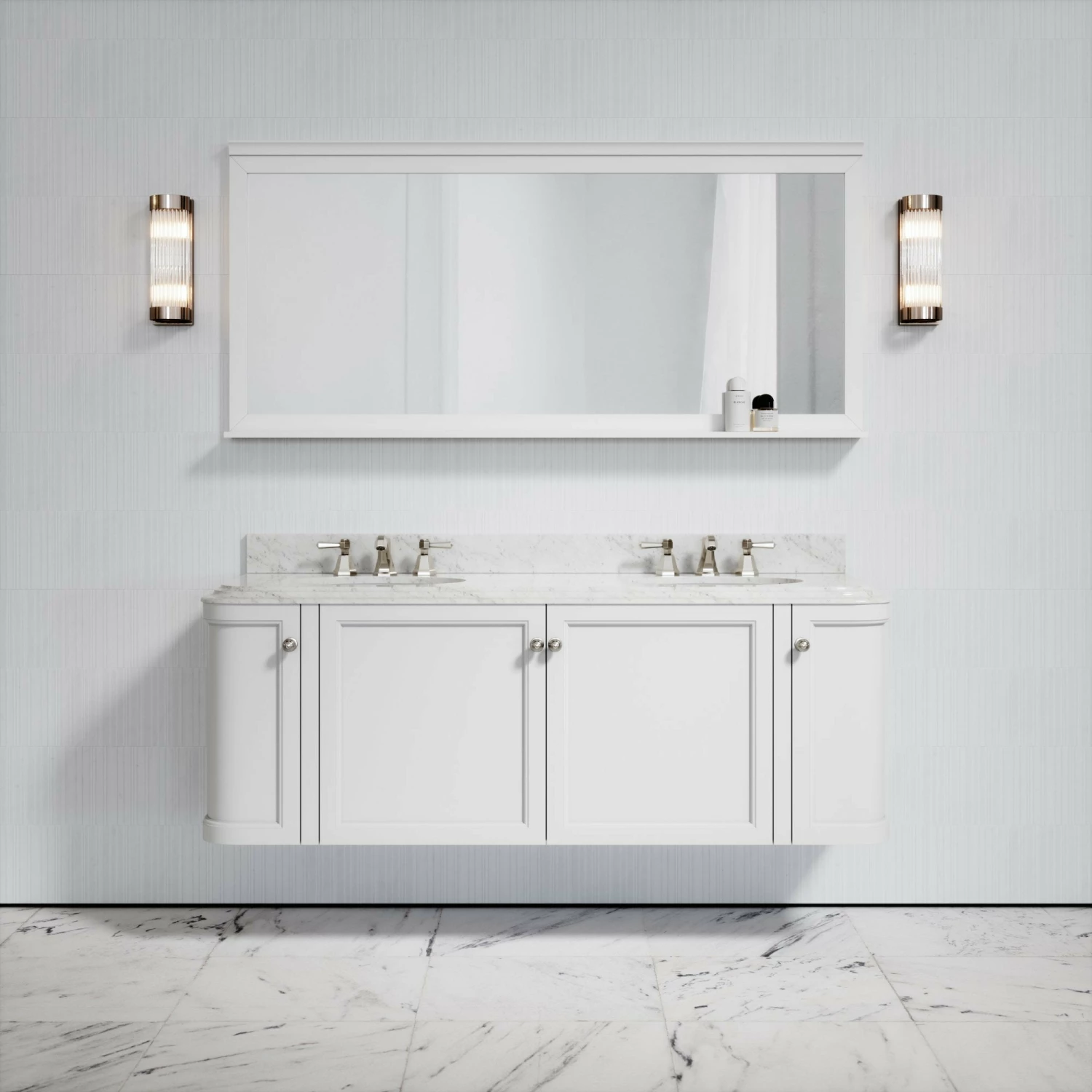 Understated elegance is a key characteristic of our Deco collection and the Charsley vanity unit embodies this; defined by its geometric lines, curved edging and finished with our luxurious Carrara marble in a polished finish.