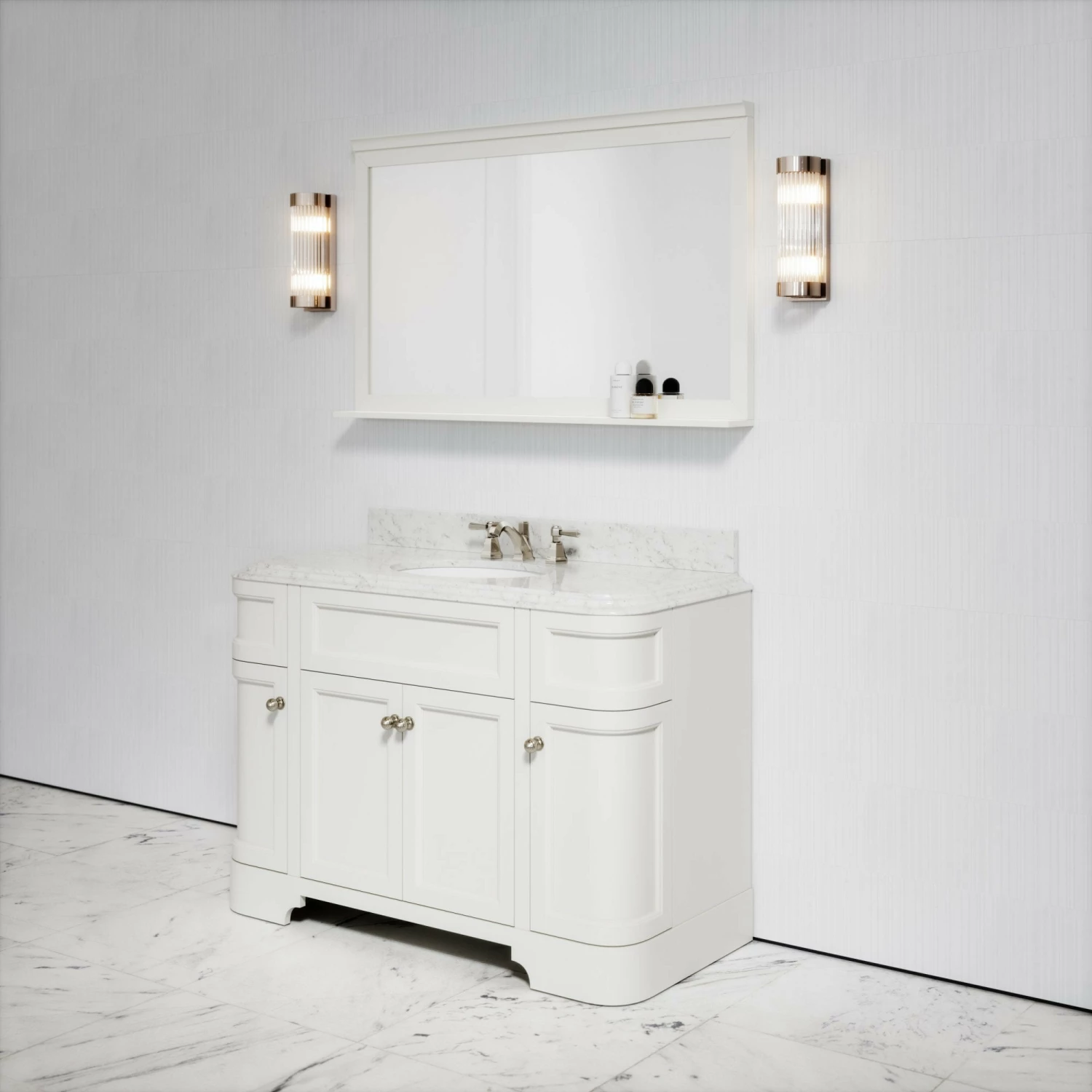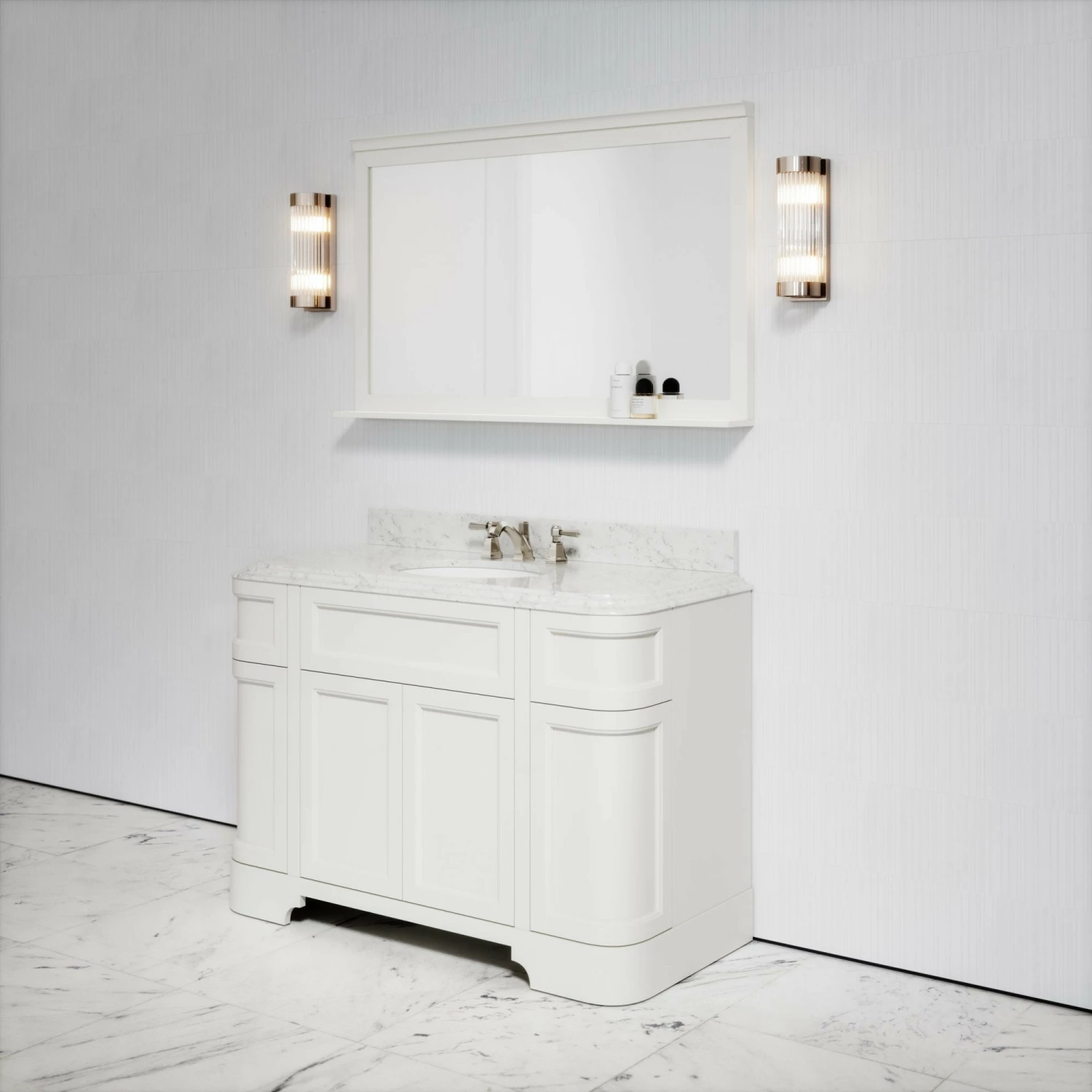 The Connaught Floorstanding Vanity Unit, in traditional muted cream, is defined by its bold shaping, smooth curvaceous edging, immaculate hand finishings – all design notes synonymous with 1920s glamour.