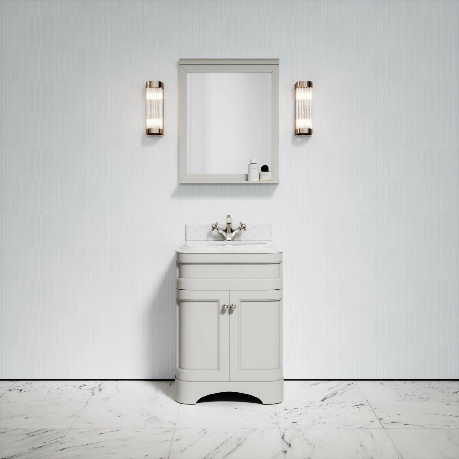 The Matte Stone Vanity Unit is crafted from durable marine grade plywood, coated in a soft matte stone finish, and is crowned by a beautiful polished Carrara marble countertop finely carved with cove ogee detailing. Alongside this, the vanity unit features an undermount oval basin and curved arch stand, in keeping with its Art Deco influence.