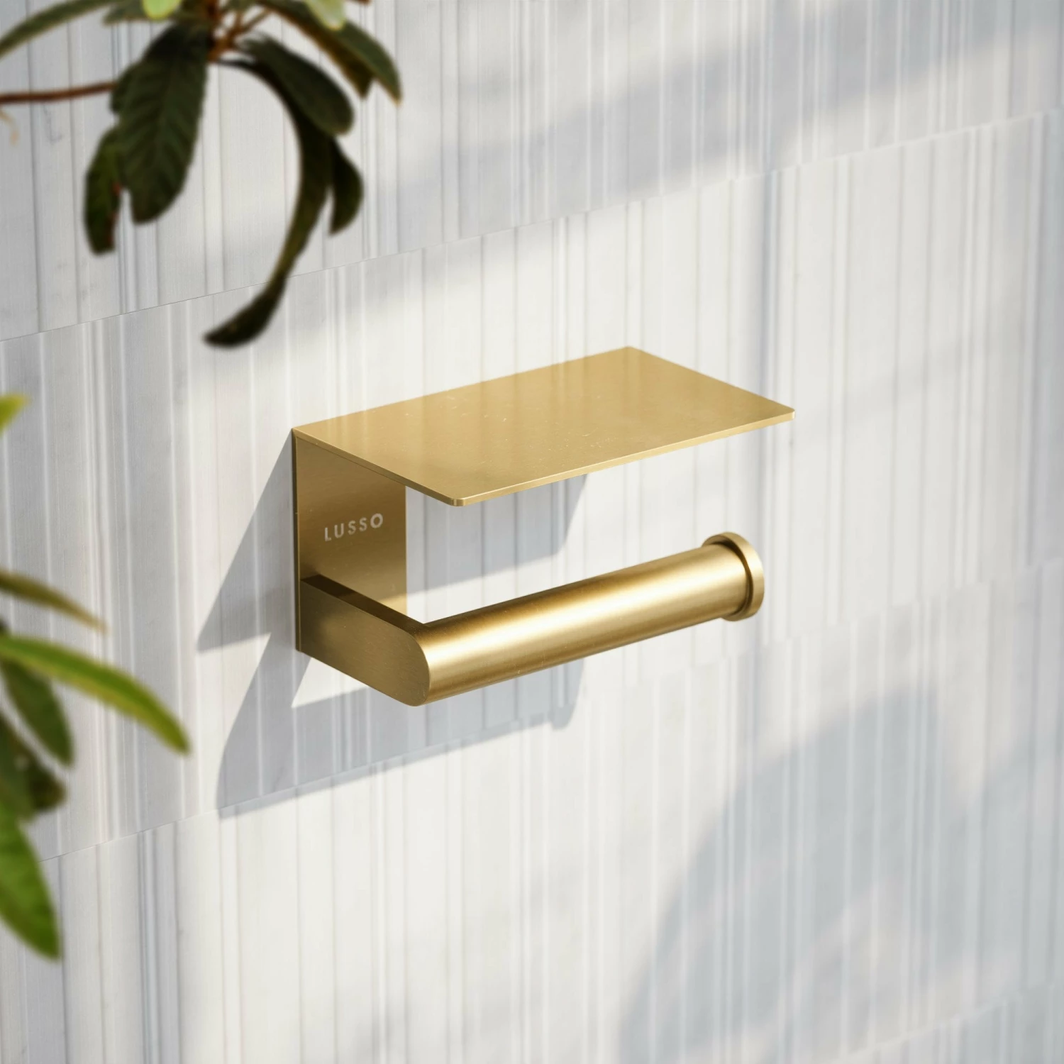 The Deka toilet roll holder is designed for use with our other gold pieces, including our soap dispensers, wall brackets and toilet brushes, each of which displays an exceptional brushed golden shade. The toilet roll holder is designed with an integrated shelf, perfect for placing anything from your phone to candles or reed diffusers.