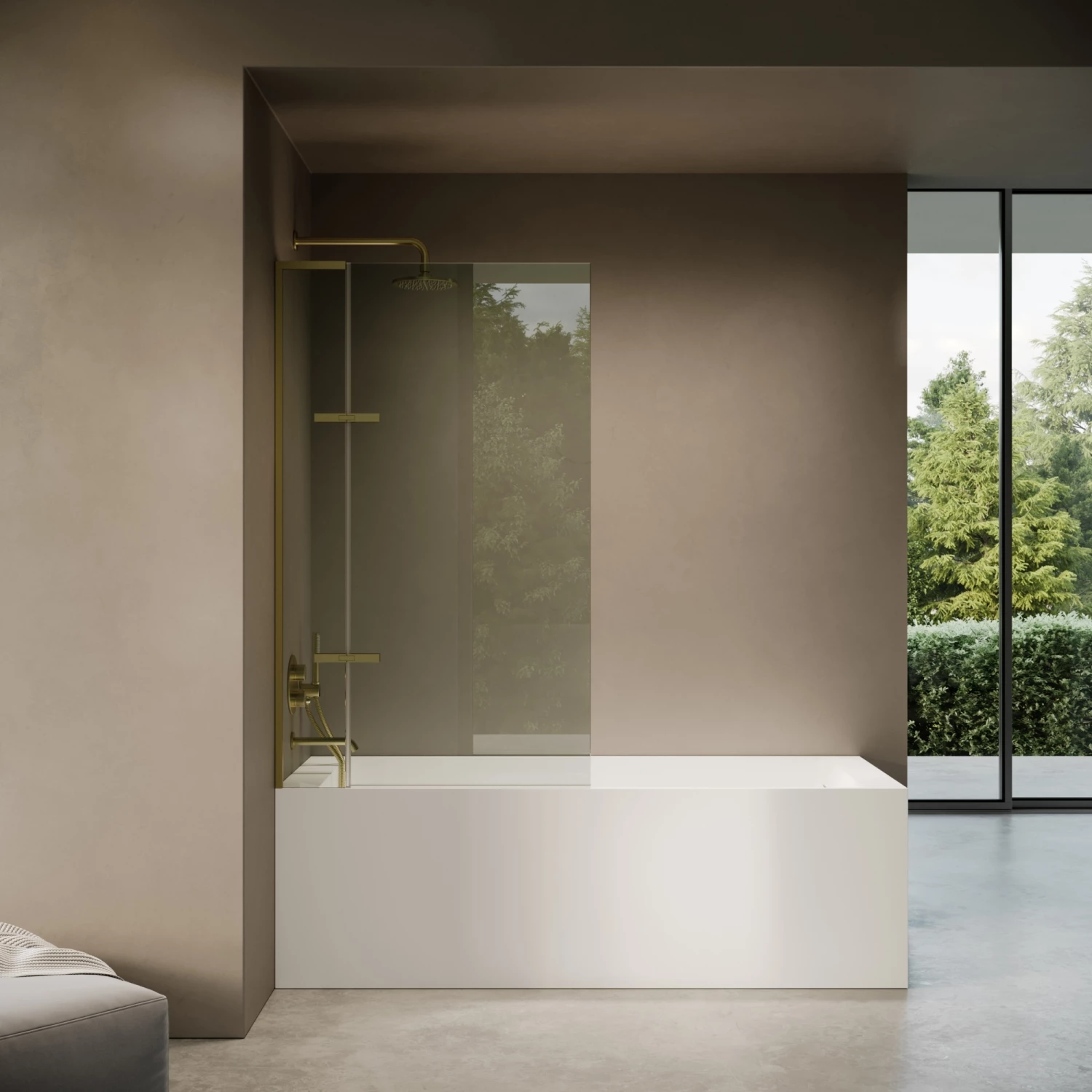 Crafted from 8mm toughened glass, the bath shower screen features brushed gold accents which adds a sense of luxe to your space. Complete your interior design with a thermostatic shower and shower accessories of the same opulent brushed gold finish.