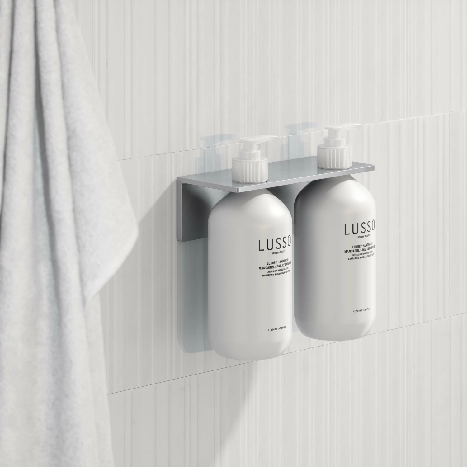 The double design ensures easy placement of a product duo, such as shampoo and conditioner, providing easy, albeit secure and concealed access. The bracket supports bottles with diameters up to 104mm and is suitable for use with all major brands.