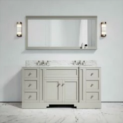 The Floorstanding Vanity Unit is crafted using marine grade plywood and is coated in a matte stone hue for both protection and aesthetic. The countertop is composed of beautiful polished Carrara marble, sustainably sourced from Italy, and features double built-in basins that are perfect for families or couples.