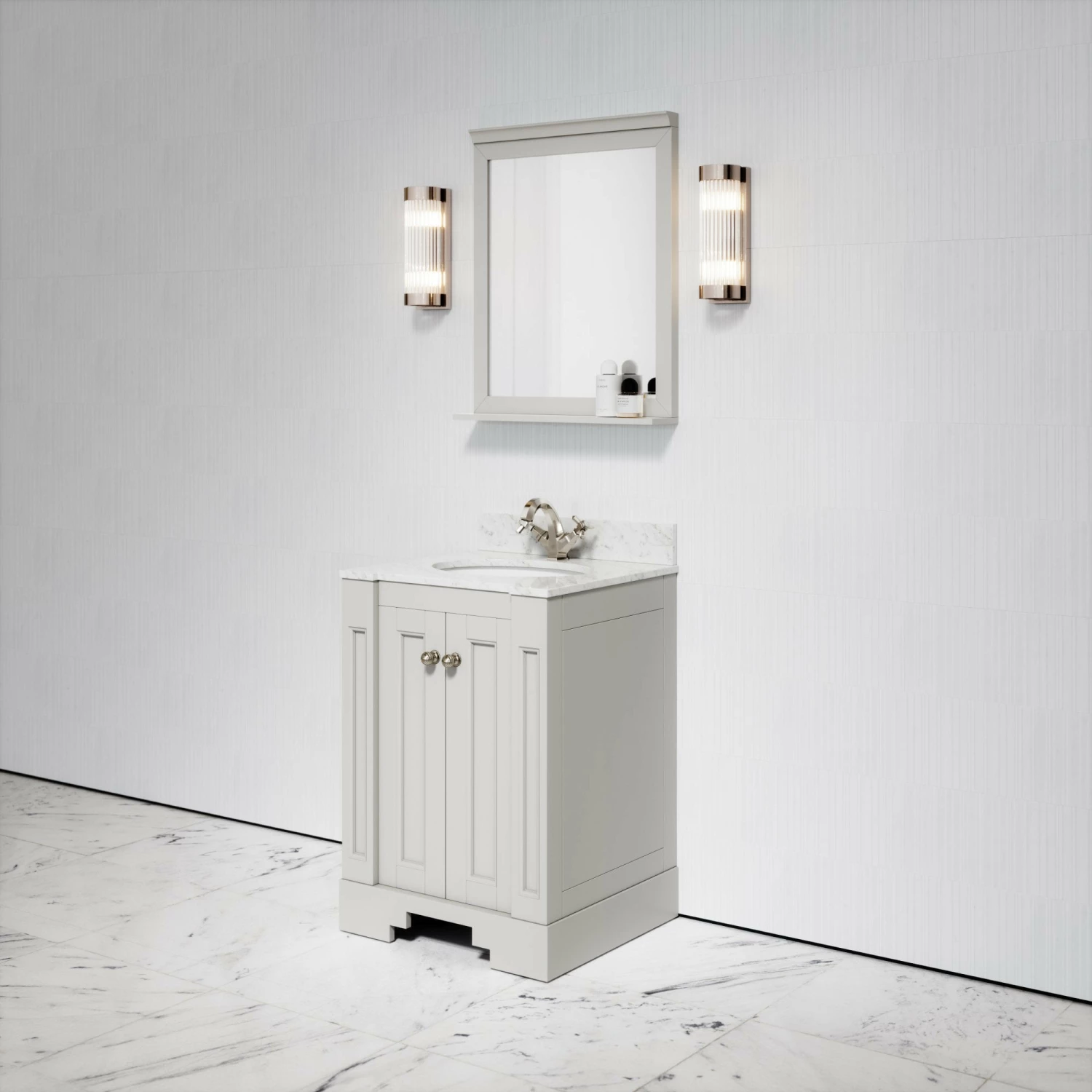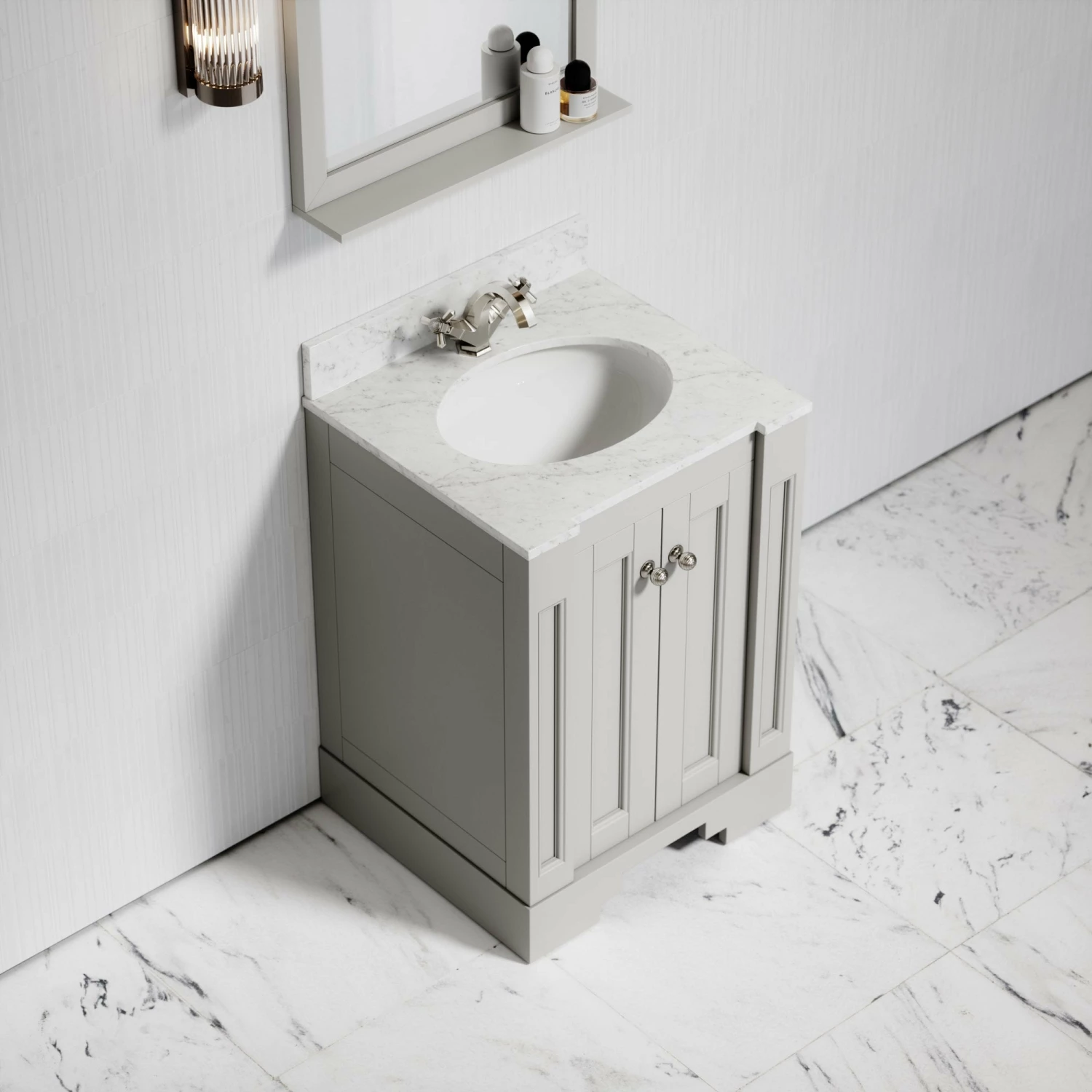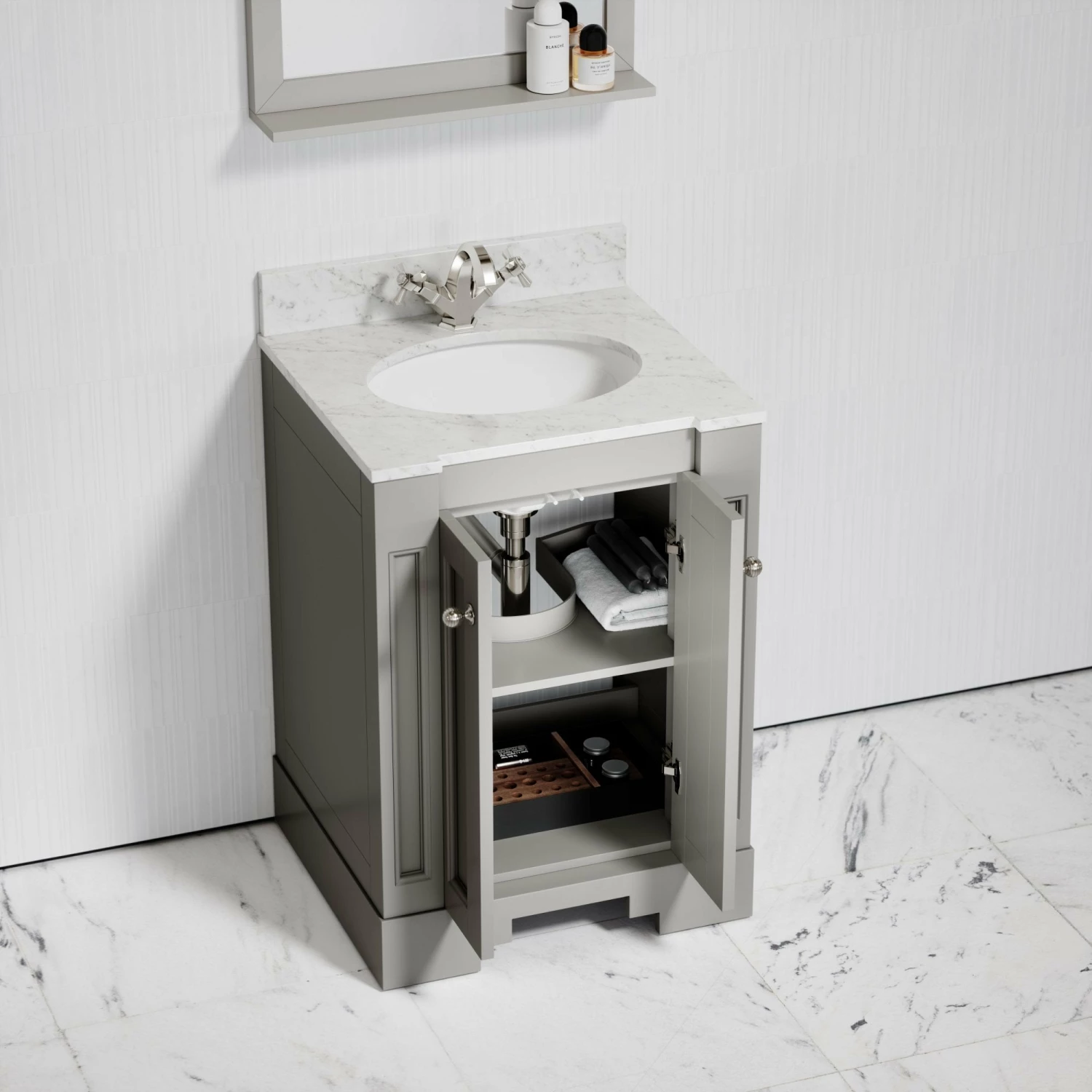 Crafted using marine grade plywood and finished in a matte stone coating, the freestanding vanity unit also features beautiful Italian polished Carrara marble surrounding a built-in basin, with structural edging showing similarity to the architecture of Art Deco.