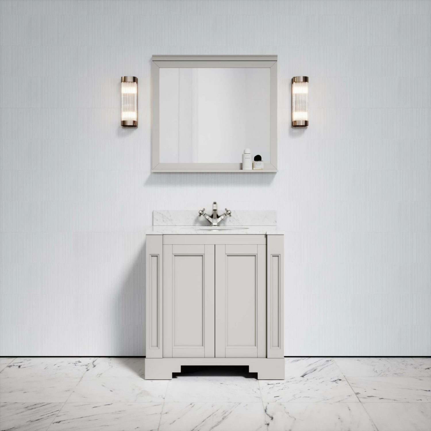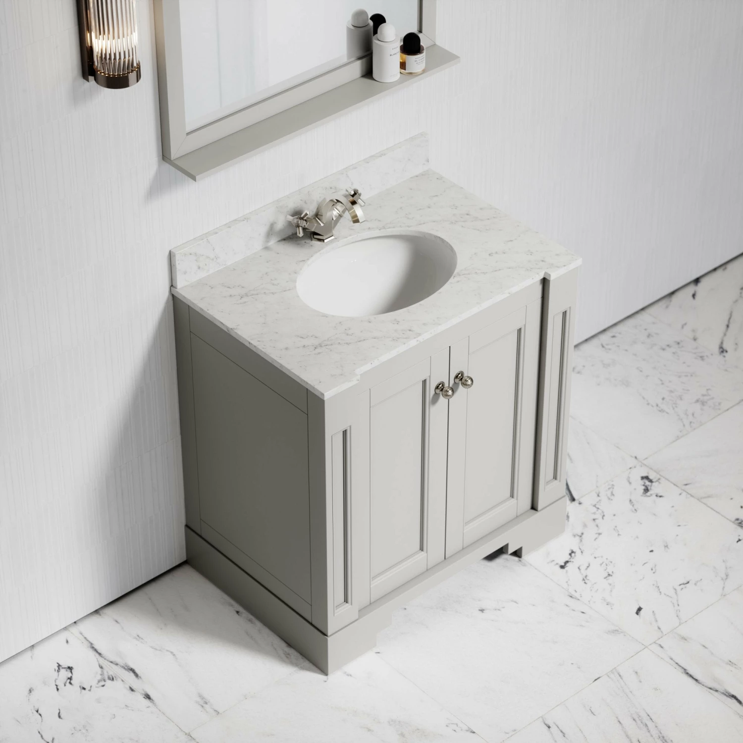 The freestanding vanity unit is coated in a muted matte stone finish that contrasts beautifully with the polished Carrara marble countertop, sustainably sourced from Italy. The cabinet is also crafted using marine grade plywood, ensuring moisture resistance and longevity.