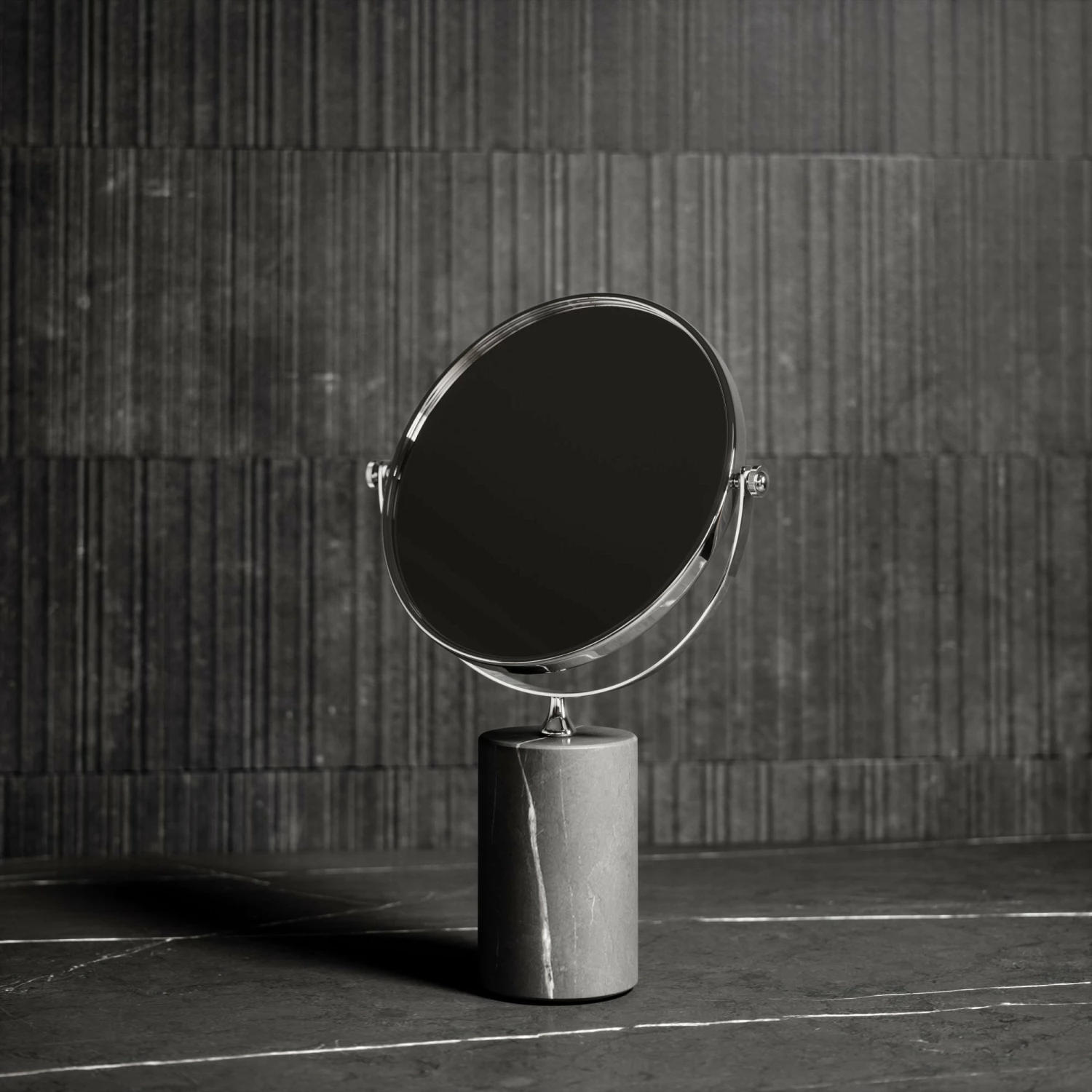 Integrating a stable anti-slip base, its fully rotational chrome frame seamlessly transitions from a standard mirror on one side to a magnified face on the other. Bringing a confident presence to any space, the multifunctional article introduces an unsuspected moment of interest with considered curves and sophisticated honed surface. An ideal addition to any bathroom or vanity area.