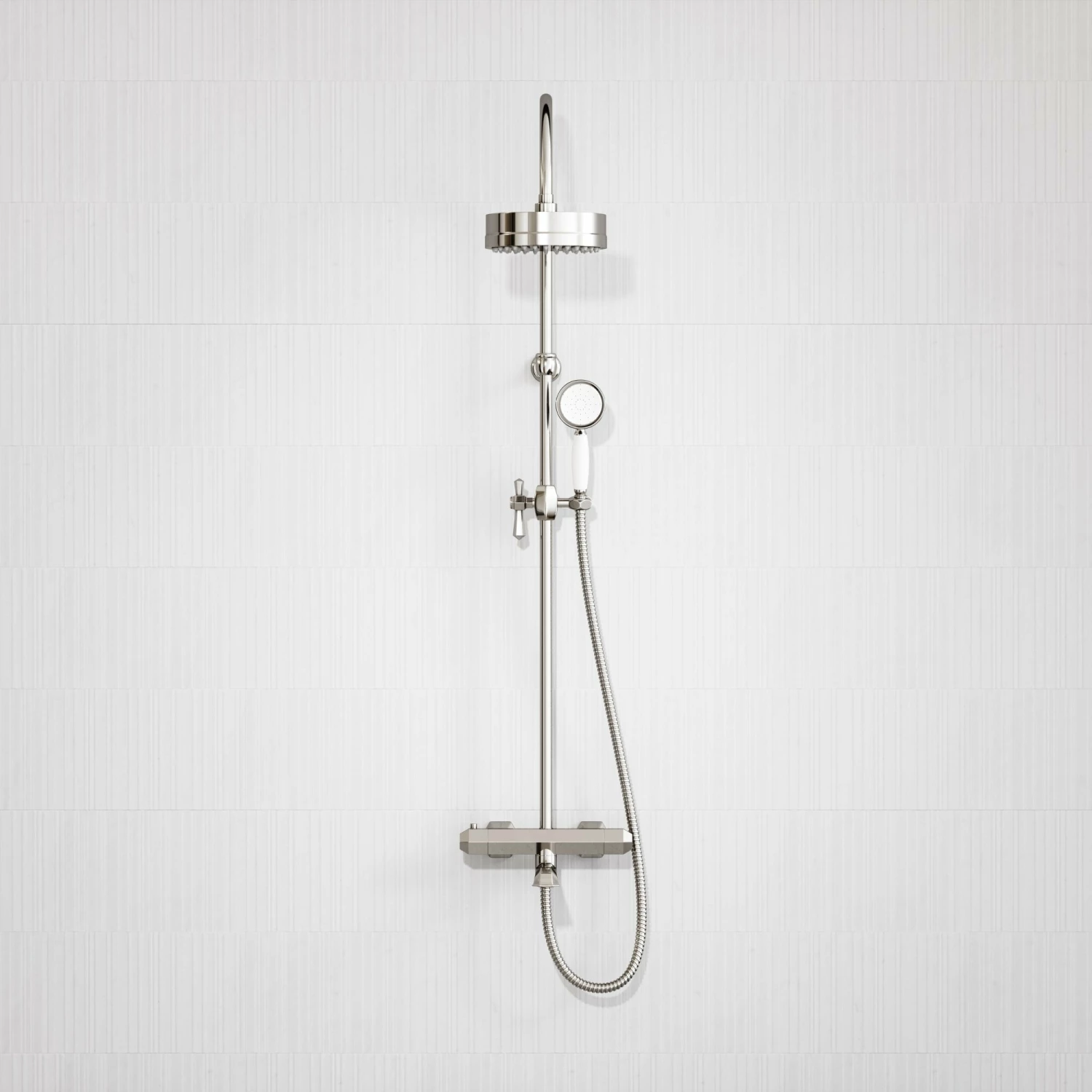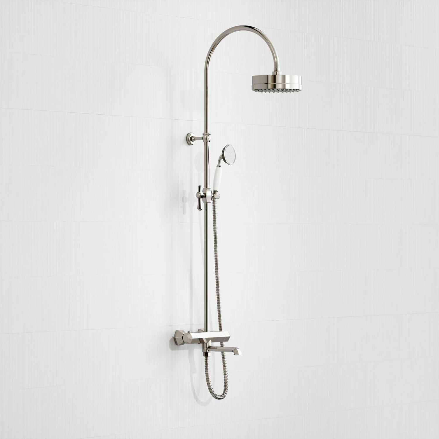 Designed to pair perfectly with other products in our Deco collection, the elegant Eton shower system showcases our regal polished nickel brassware as well as geometric shaping that references the iconic sunburst motifs of the Art Deco era. This three way shower system is practical for installation above a bath, giving you the best of three options – an overhead shower, handheld shower and a bath filler tap.