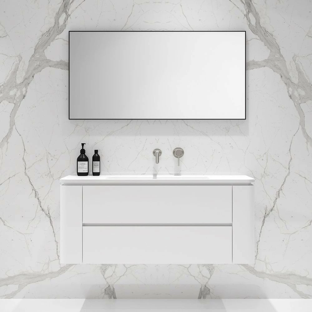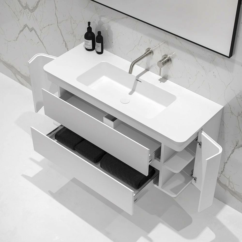 The Lusso Fontane Wall Hung Vanity Unit (with stone basin included) is distinctly modern without sacrificing sophistication. With an innovative, bold design and generous storage space, this striking vanity unit brings luxury into any interior. The tactile white curves of the Fontane give this unit unmistakable feminine energy, with clean lines that capture spacious soft-closing drawers and two concealed cupboards. Enriched by solid materials and creative craftsmanship, the Fontane Matte White 1200mm Bathroom Vanity Unit redefines contemporary elegance.