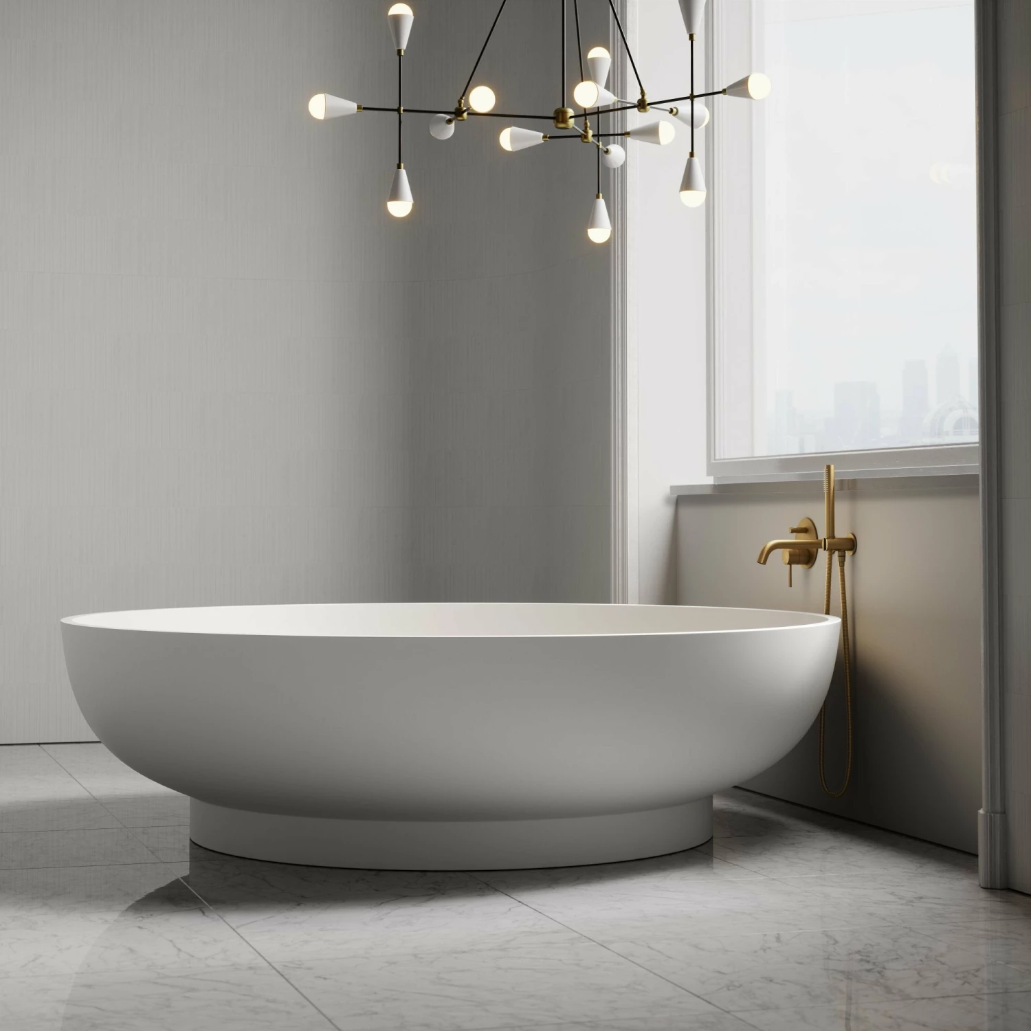 Designed for truly indulgent spaces, the Lusso Stone Grande Stone Resin Freestanding Large Round Bath is the epitome of luxury bathing. Incredibly spacious, deep and decadent. The Grande is a testament to the innovative design and premium British design process that ensures each piece is built to last. This inviting freestanding bath will elevate any space with its sophisticated design, beauty, and glamour.
