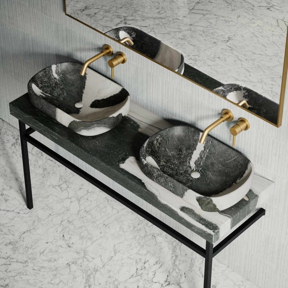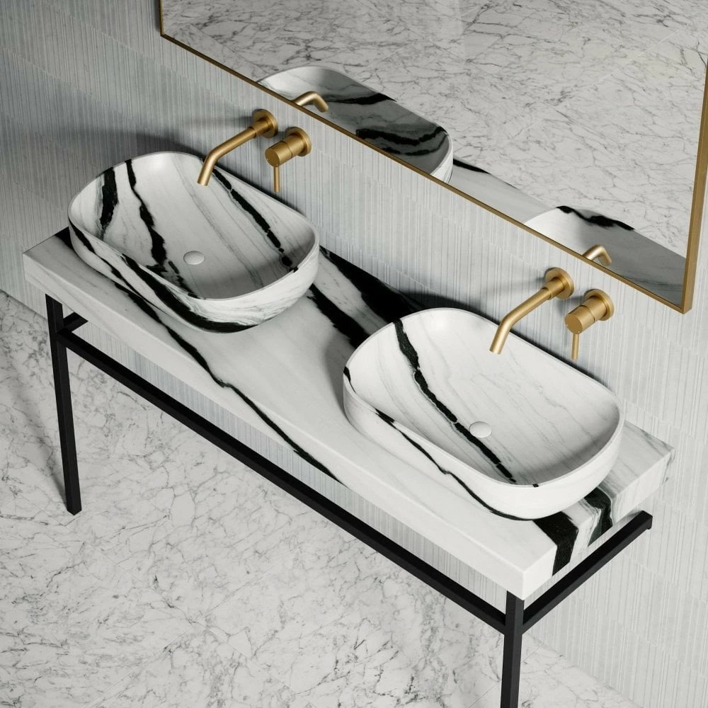 Boasting high-quality finish, Panda Marble originates from China. A unique surface with a vast crisp white background accompanied by broad weaving of contrasting black and gunmetal grey swathes. Every so often, conditional to each independent marble block, moments of heritage green and occasions of tanned almond hues are revealed; an undeniable way to add marvellous character to a bathroom. Due to the organic formation of marble, the proportion and arrangement of veining can range from intense heavily concentrated areas to sparse pure white with less dense black markings.