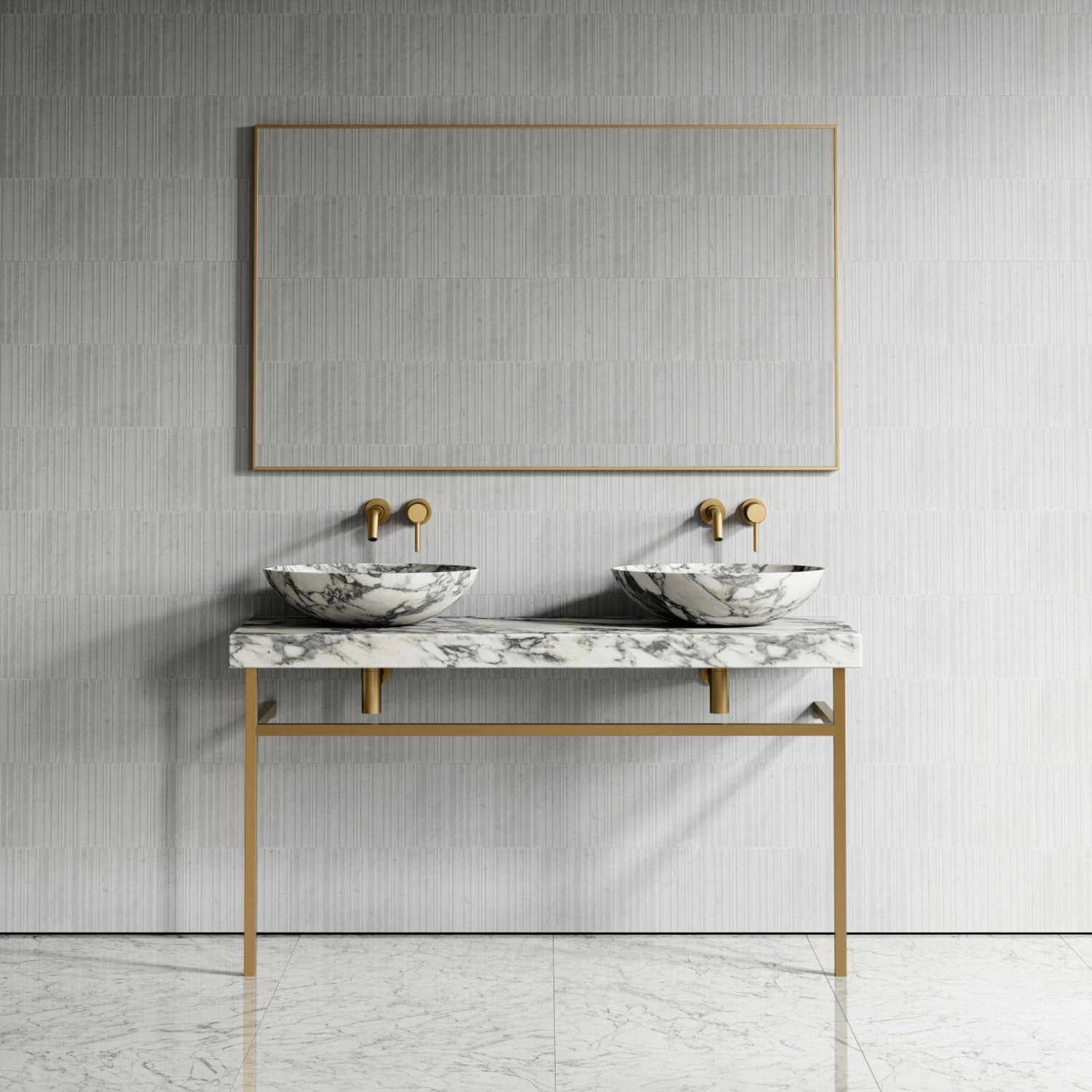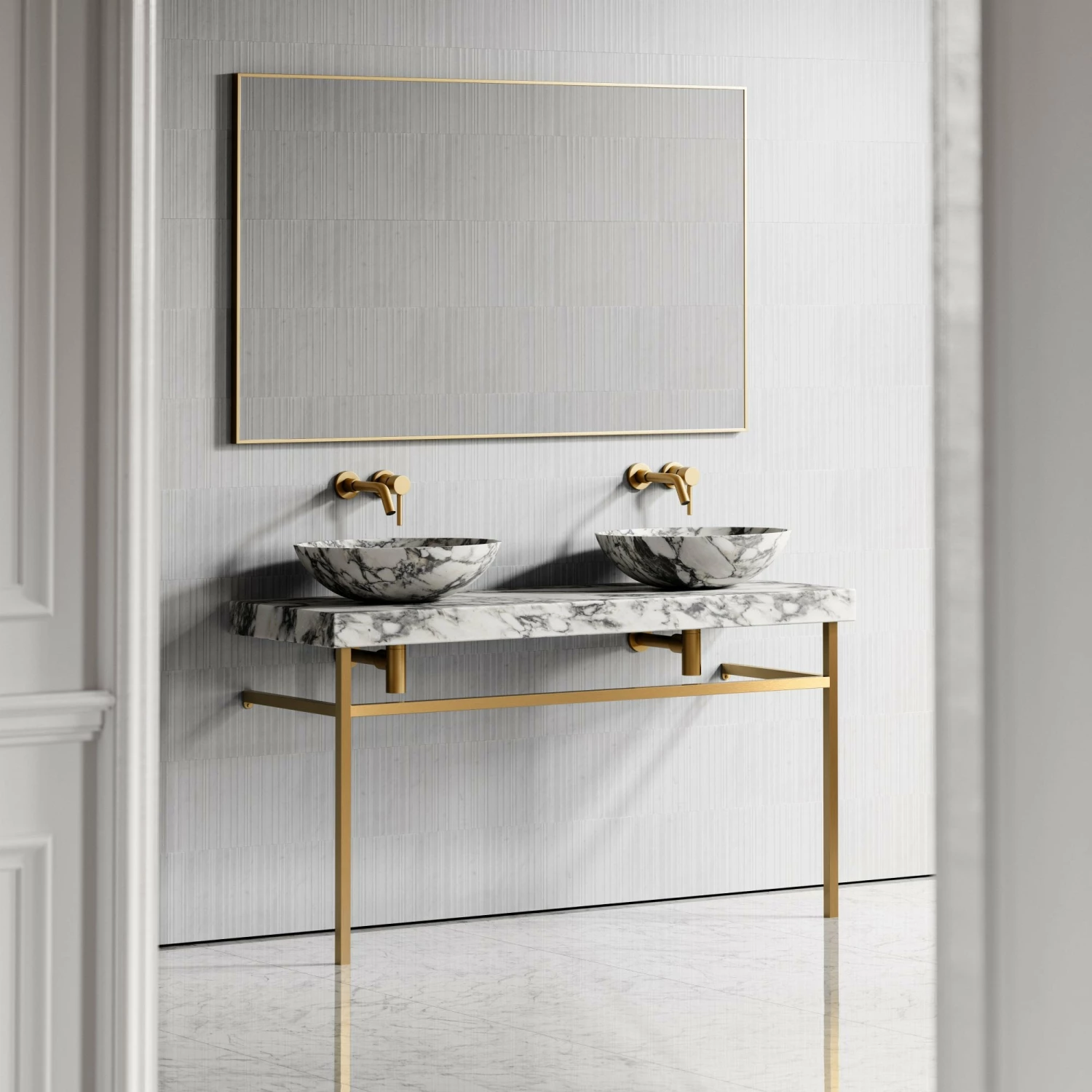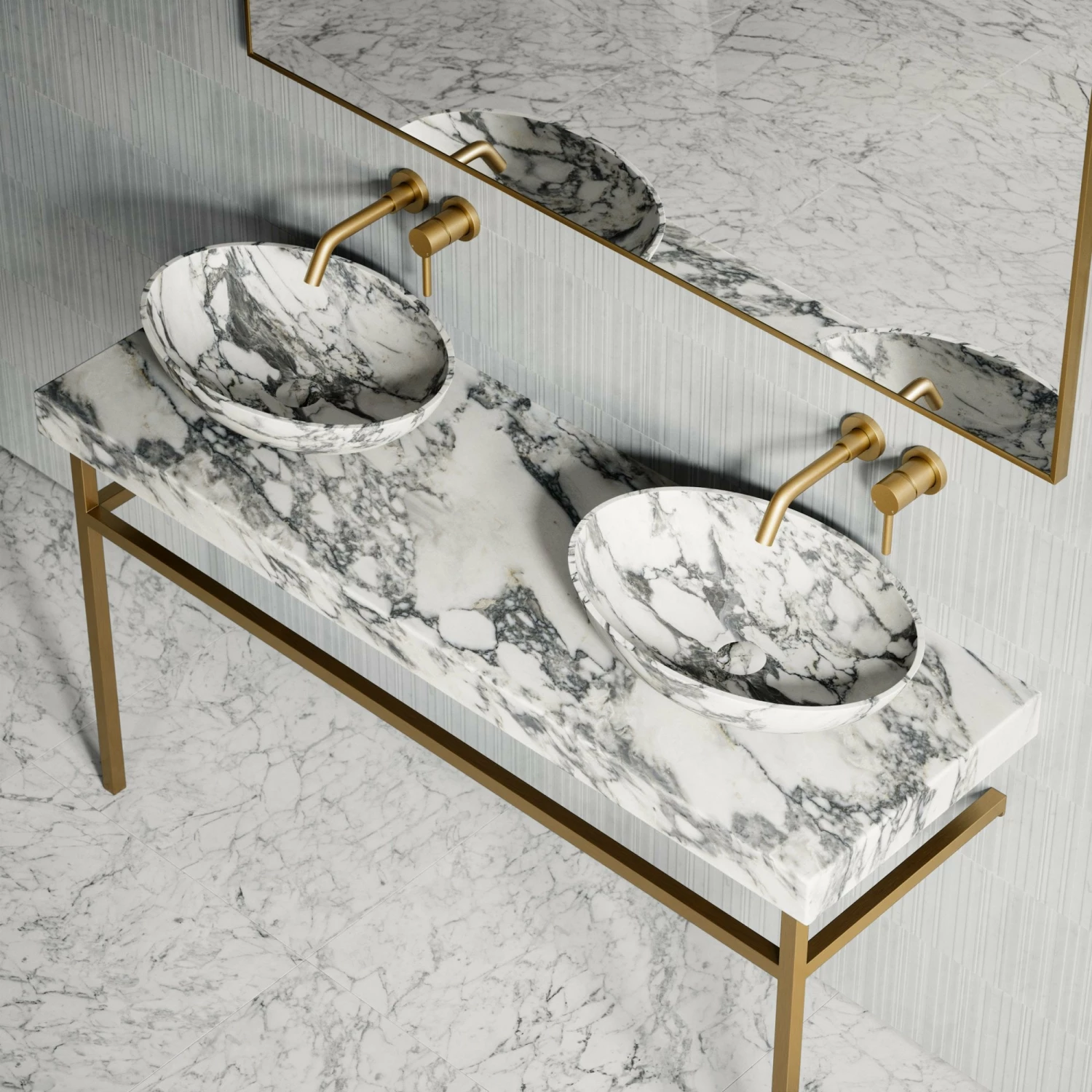 As part of our groundbreaking marble range, the Lomazzo Countertop Vanity Unit exudes richness, marrying brushed gold accents with Arabescato marble.
