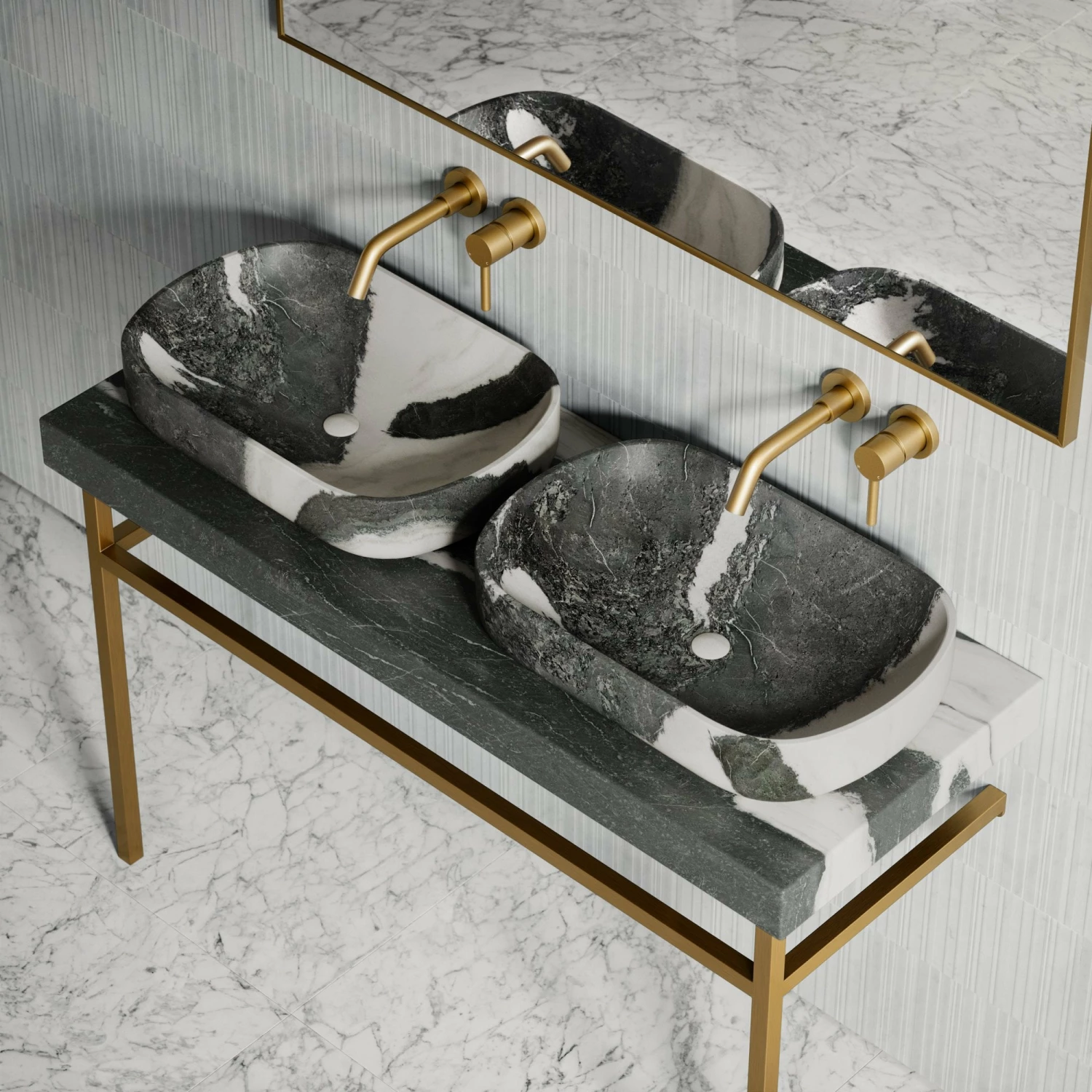 The Lomazzo Countertop Vanity Unit exudes grandeur, defined by its brushed gold framework and opulent Panda marble.