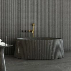 The bath boasts a distinct rectangular silhouette which can sit freestanding or close to the wall, perfect for modular bathrooms where space is limited or for those wanting to make a striking impact in a master bathroom. The Maddox stone tub finely displays sleek fluted edging, matching the basins of the same design.