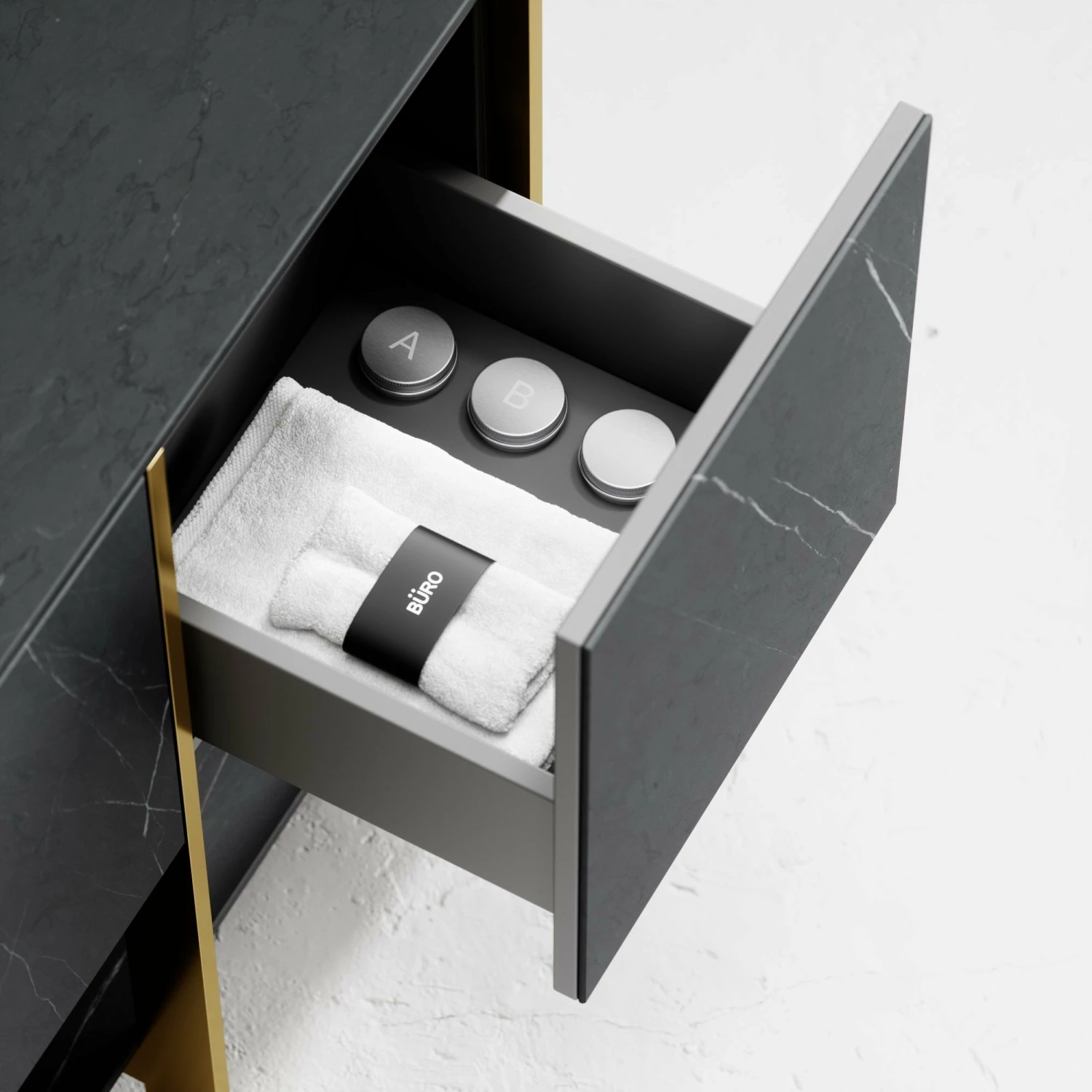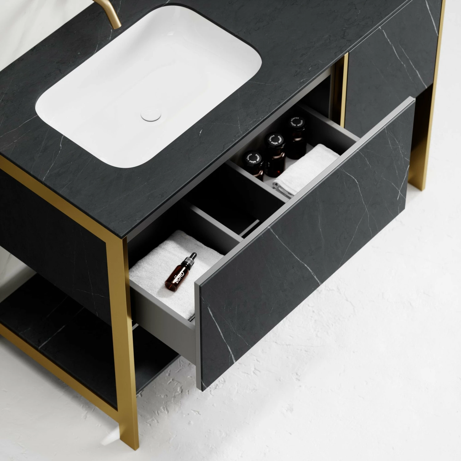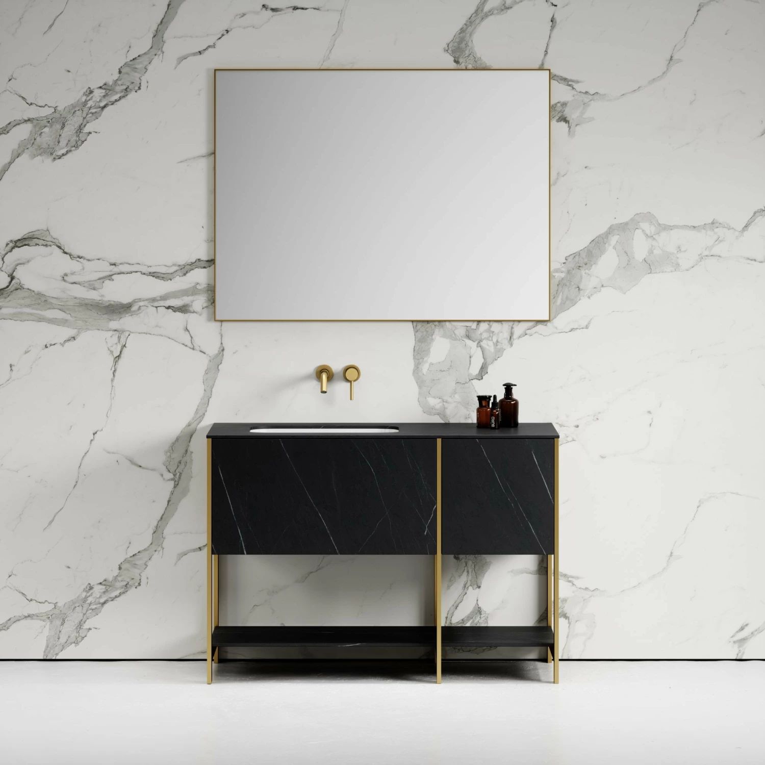 Luxuriously designed to complement modern interiors, the Lusso Moode Freestanding Vanity Unit (with basin included) provides instant drama. The elegant black marble is framed by our signature warm brushed gold, creating a stylish piece that is perfect for both contemporary and heritage style bathrooms. Ample storage elevates the Moode from style to function, providing the perfect place to store bathroom essentials.