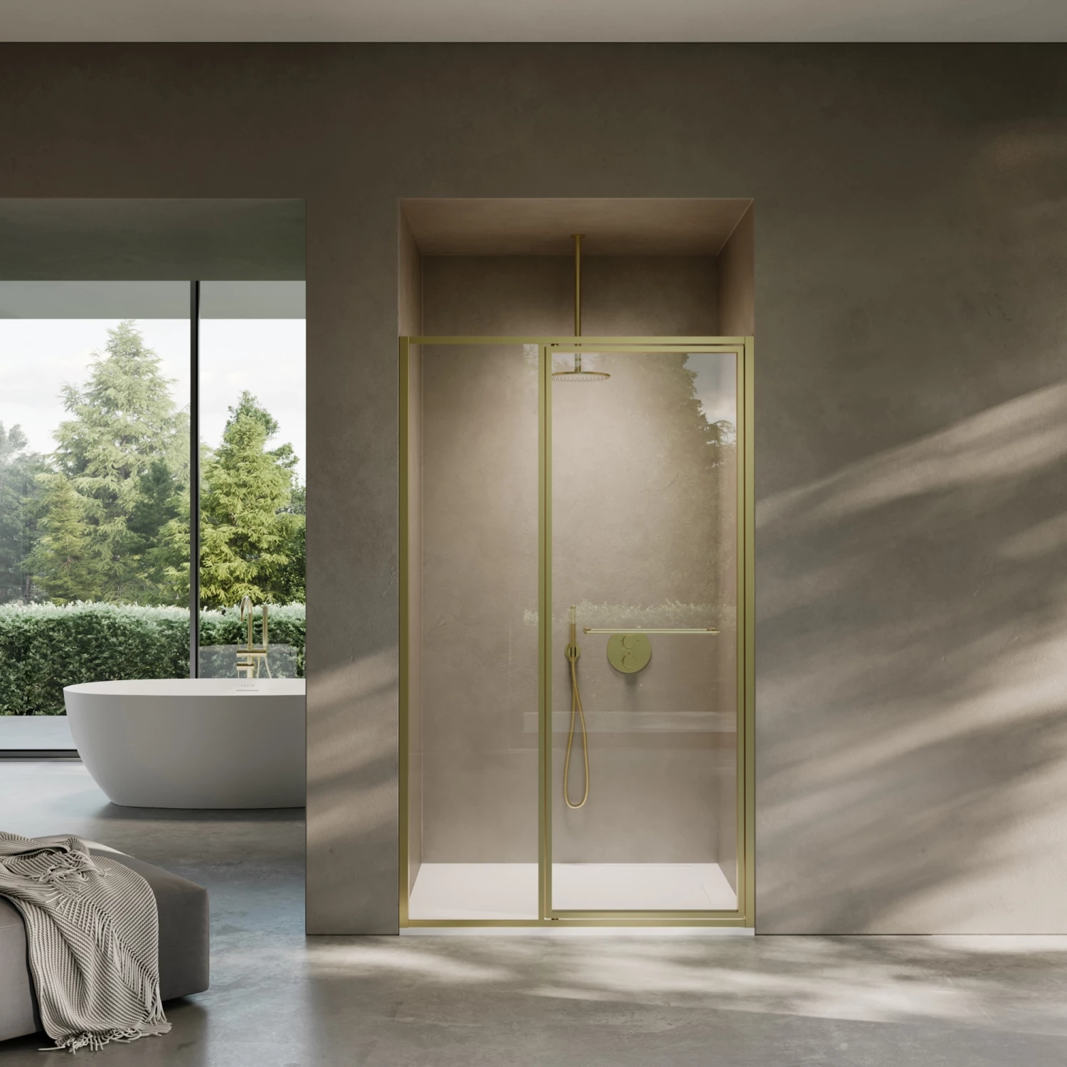 Designed for use with our extensive collection of brushed gold bathroom pieces, the Nouveau Hinged Shower Door & Screen is the perfect choice for modern luxury homes.