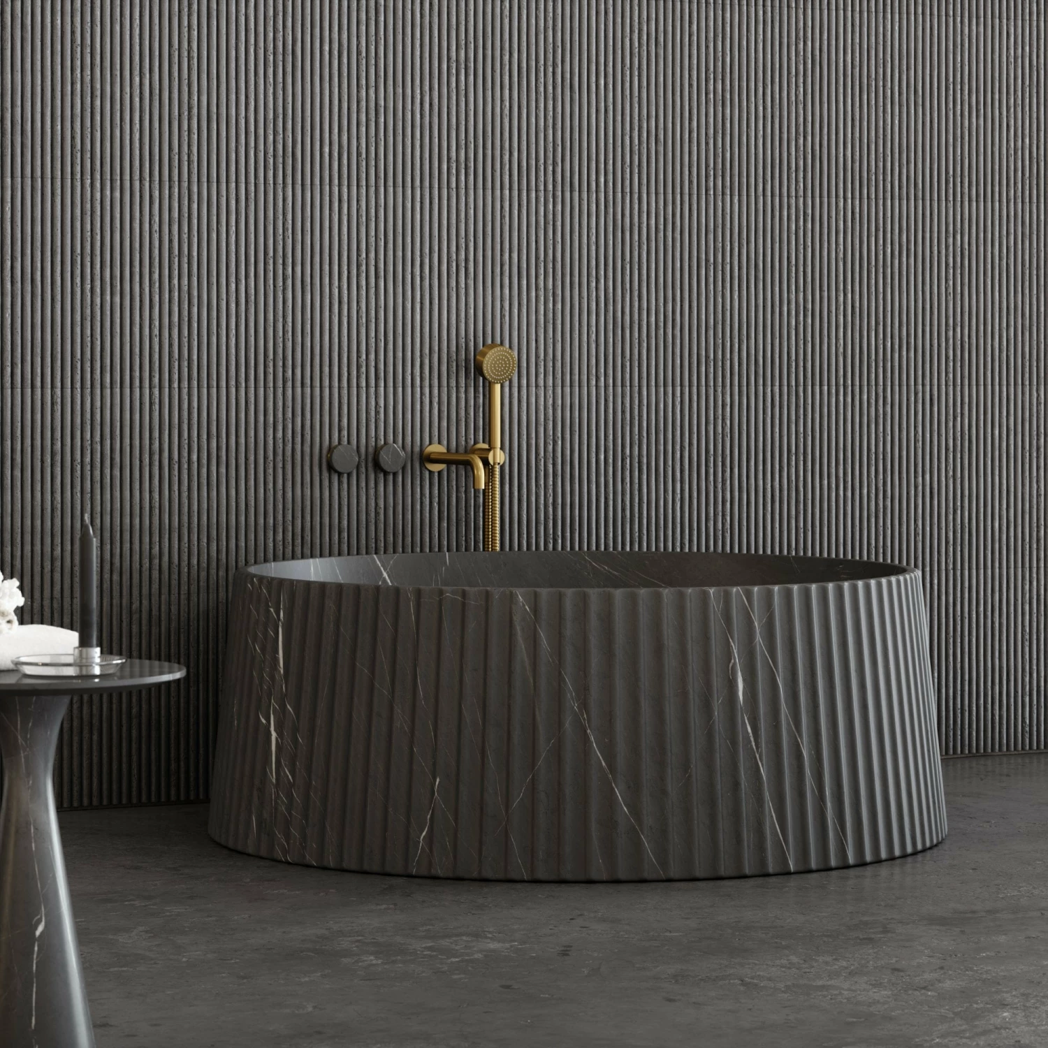 The Pietra Grey marble bathtub boasts a distinctive lamp shape which sits as the centre piece to a master bathroom suite. Handcrafted with meticulous attention to detail, It finely displays sleek fluted edging, matching the basins of the same design.