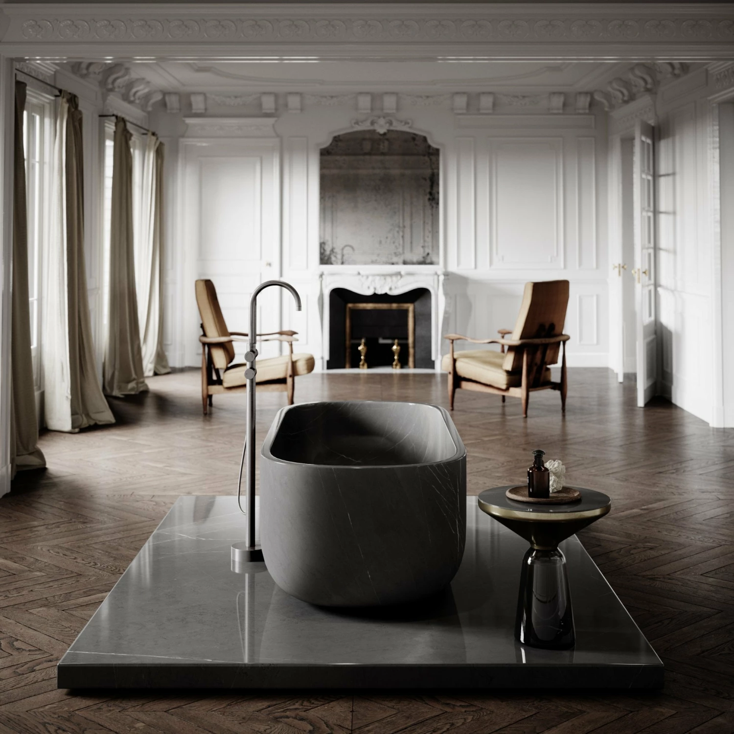 Extracted from the province of Isfahan located in Iran, this timeless freestanding bath is formed from a single block of silken velour Pietra Grey marble. Grey by name, Pietra’s tone is a secret seduction. Consisting of a smoked base, bronzed hazelnut undertones saturate its body whilst striking white veins pierce throughout. Upon a closer inspection, quiet threads of lead grey often meander, pools of glassy crystallisations amble around, whilst delicate glints of copper and gold glance from time to time. Undeniably captivating, Pietra Grey’s textural character bears endless stories of discovery.