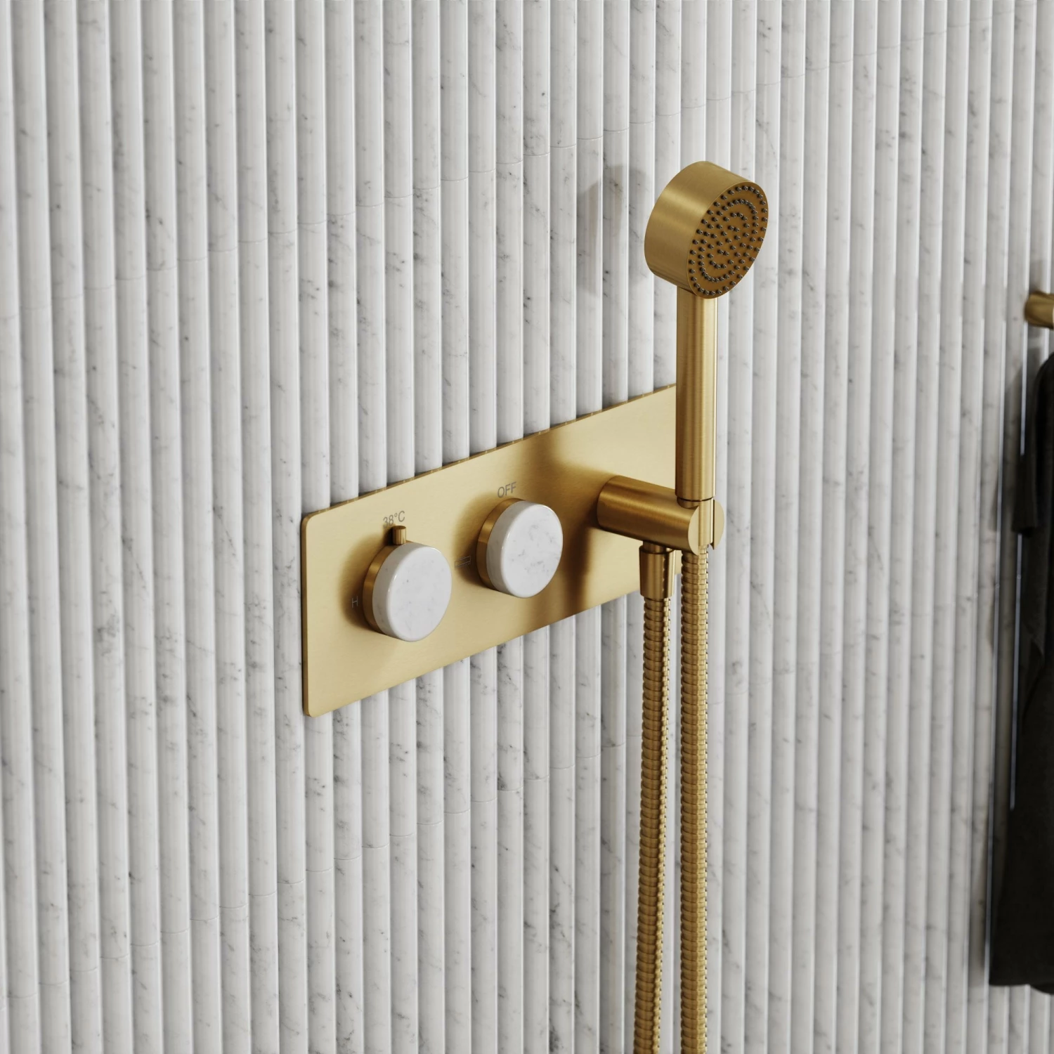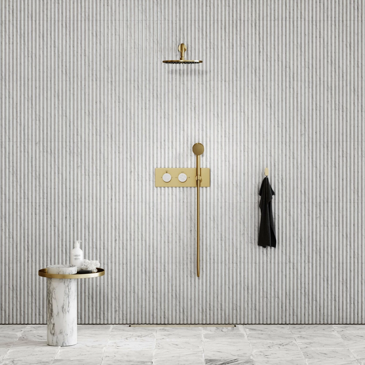 Featuring one of our most popular brassware finishes – brushed gold – and paired with the soft grains of Carrara marble, the Porto thermostatic shower is visually stunning and of premium quality carved from the same blocks of marble we use to create our Carrara baths and basins to show similarity in its colours and markings.