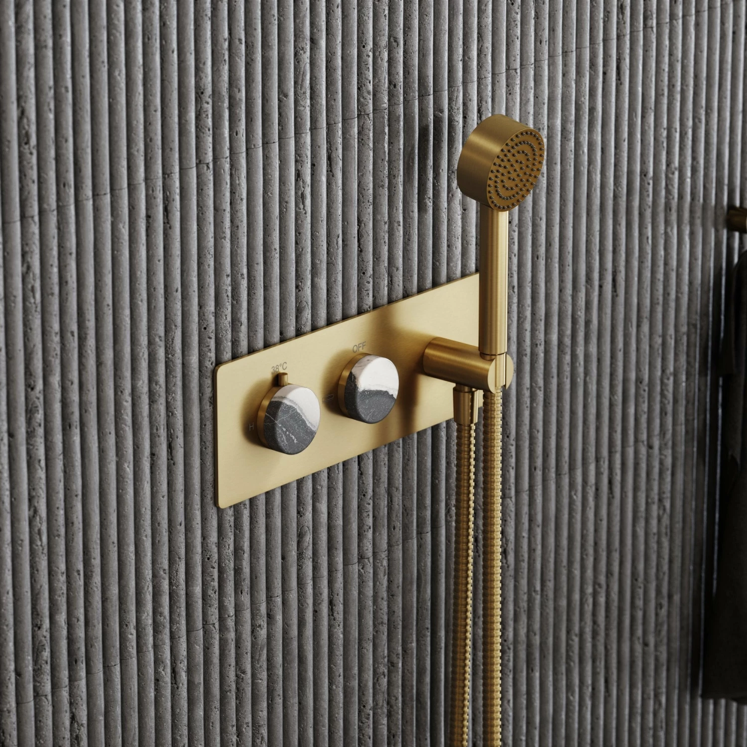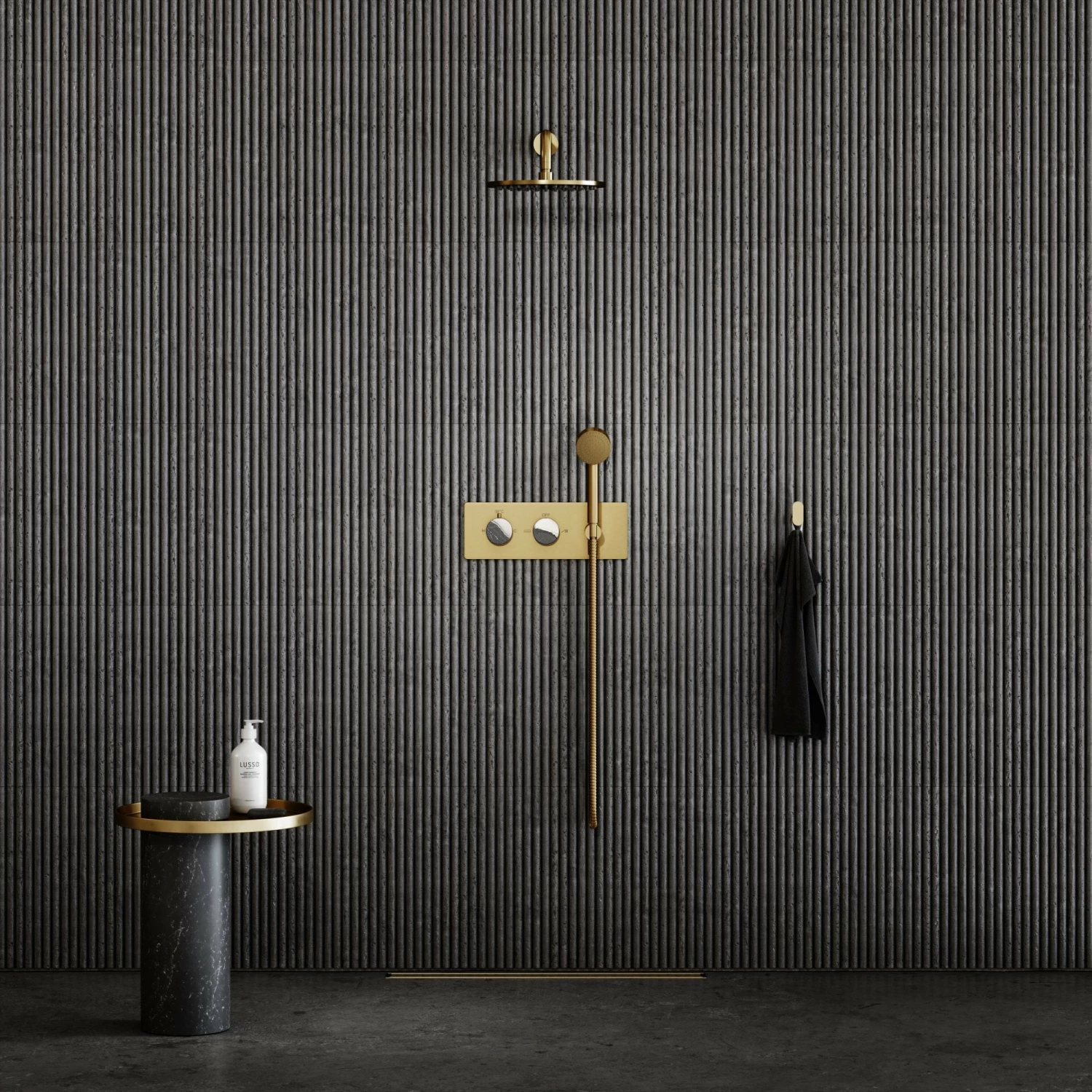 For this collection, we’ve fused together the beautiful Panda marble with our signature brushed gold brassware, creating a shower system that denotes fine luxury whether placed in a home or hotel. Each piece of Panda marble has been carved from the same blocks used to create our baths and basins to ensure similarity in its shades and markings.