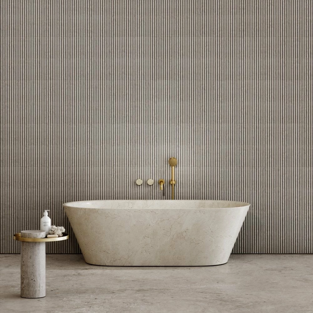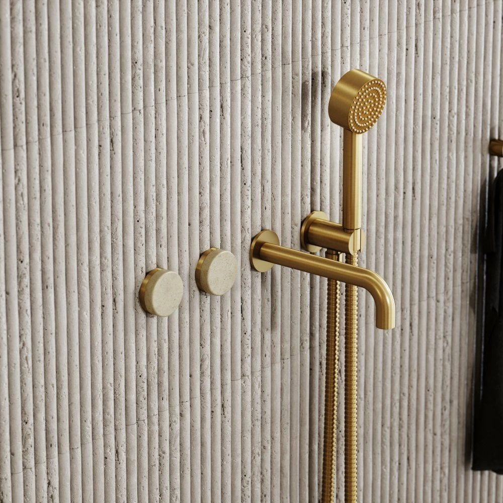 The wall mounted bath filler, showcasing a bath tap and handheld shower, has been created using progressive mixer technology, allowing temperature and flow control from the single levers, and ensures efficiency and sustainability through the reduction of hot water wastage The Crema Marfil levers have been carved from the same blocks as the marble used to create our baths and basins, meaning that the products show similarity in colour and markings, perfect for styling with each other.