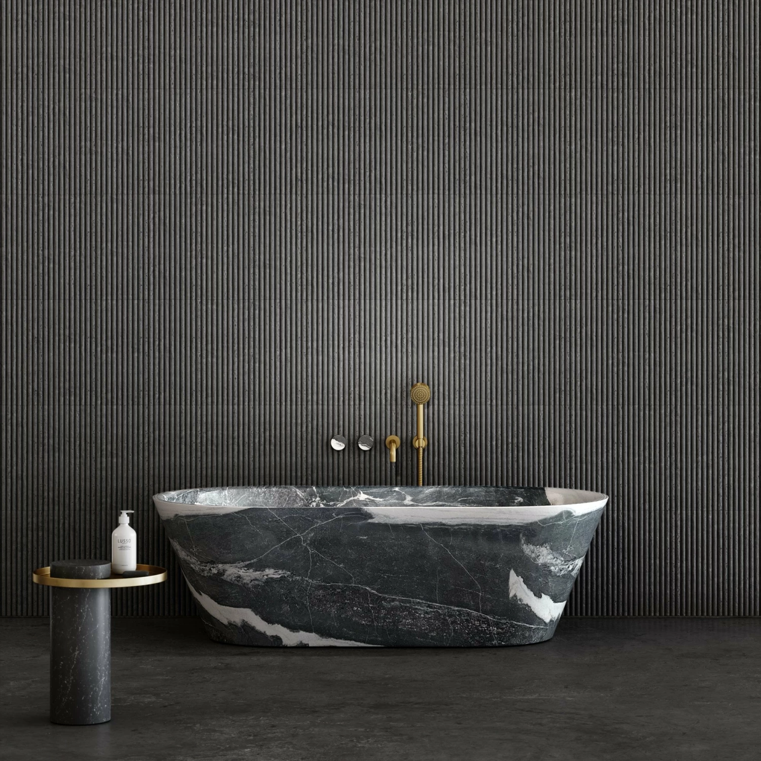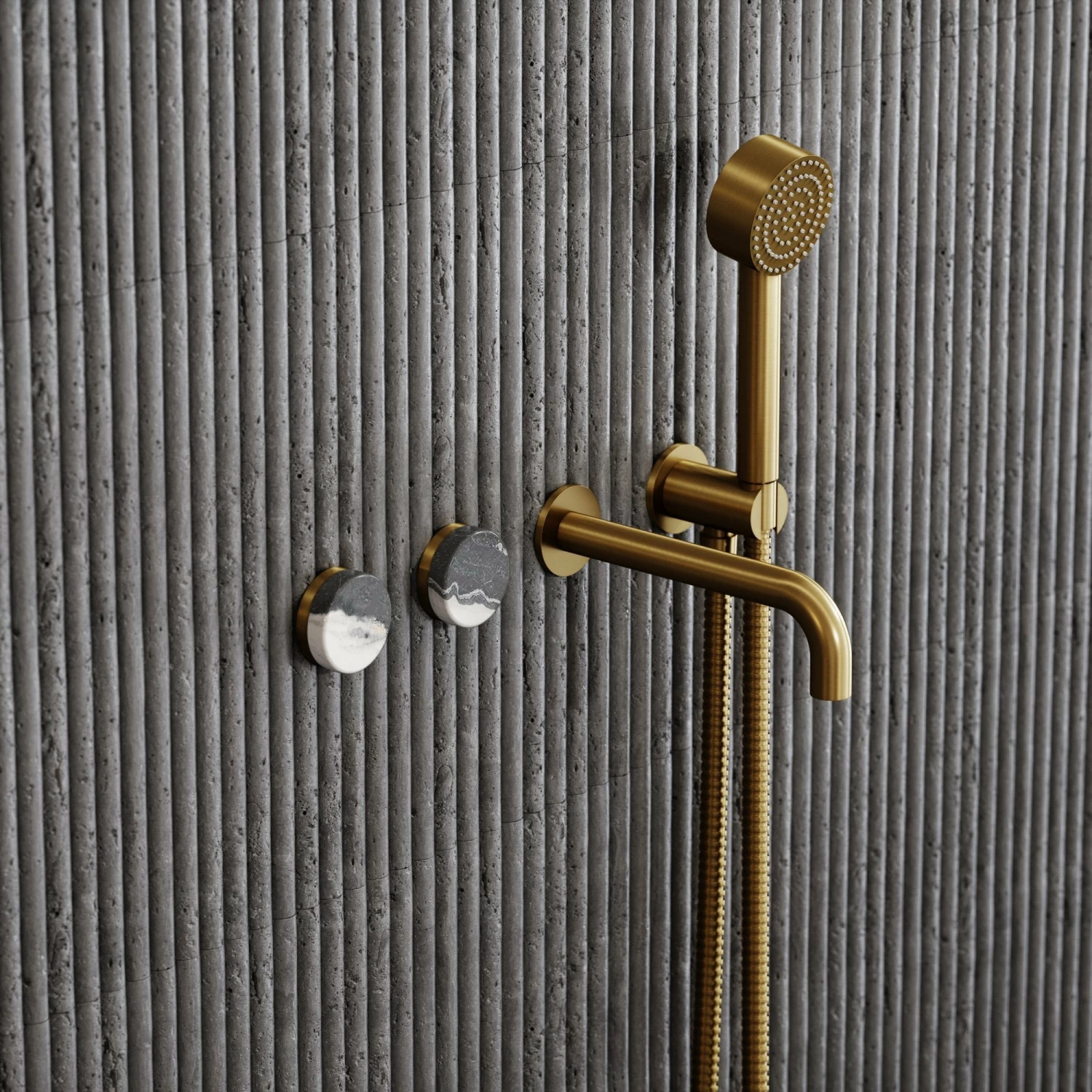 The wall-mounted bath filler, showcasing a bath tap and handheld shower, has been created using progressive mixer technology, allowing temperature and flow control from the single levers, and ensuring efficiency and sustainability through the reduction of hot water wastage The Panda levers have been carved from the same blocks as the marble used to create our baths and basins, meaning that the products show similarity in colour and markings, perfect for styling with each other.