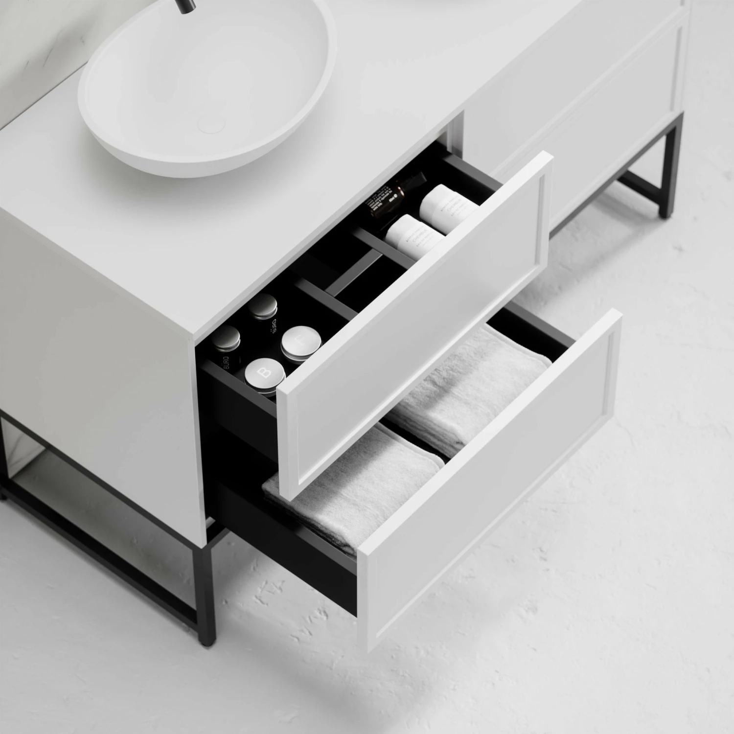 If you are looking to create that luxury hotel style bathroom, the new Lusso bathroom range of hotel-inspired vanity units is exactly what you are looking for! This new range of stylish vanity units were designed by our own in-house designers and are totally exclusive to Lusso. This fine luxury freestanding vanity unit is a stunning display of bathroom design, allowing for storage space and style in one. The internal drawers have been designed to allow two basins to be installed, although this is optional! You can use one basin to the left or right or double basins!
