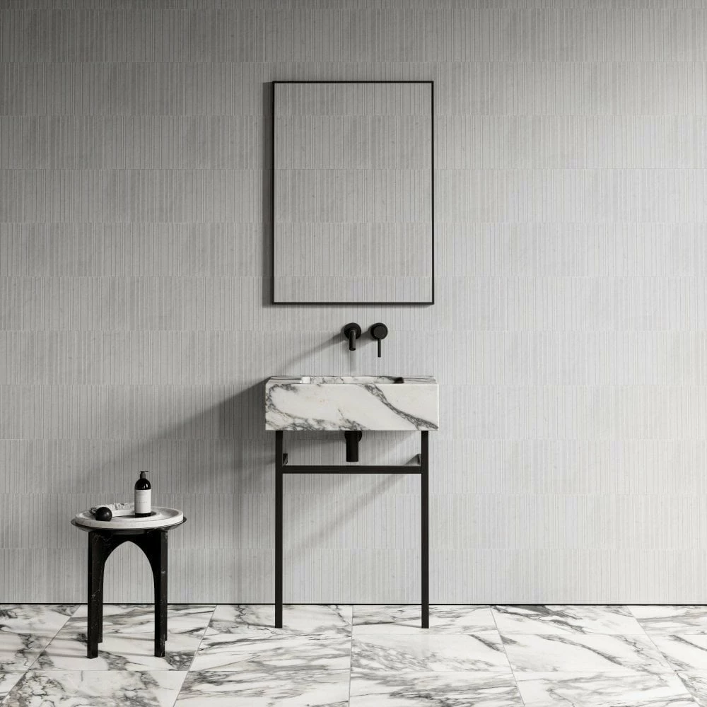 An indulgent expanse of solid marble creates this captivating basin floating serenely a-top its sleek black legs. Flaunting an effortless silhouette, the Vernante has a weightless appeal thanks to its slender stainless steel frame.