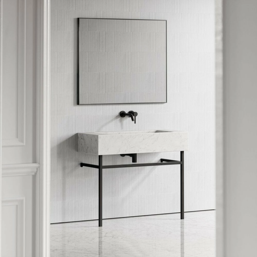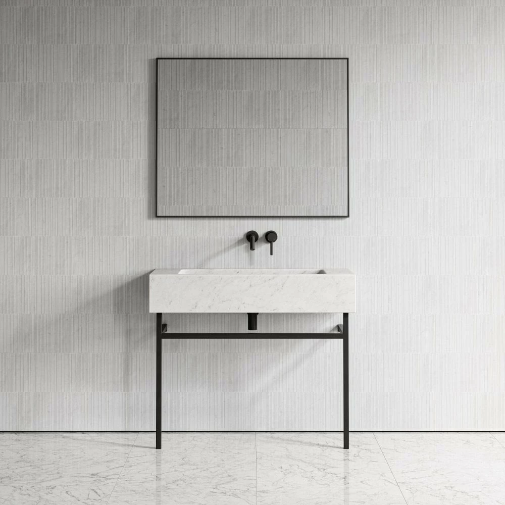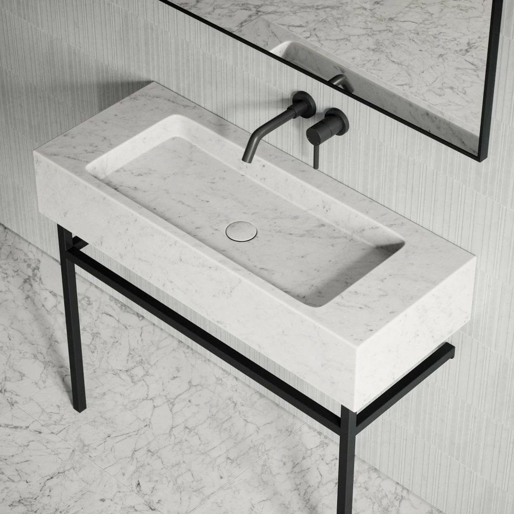 An indulgent expanse of solid marble creates this captivating elongated basin floating serenely a-top its sleek black legs. Flaunting an effortless silhouette, the Vernante has a weightless appeal thanks to its slender stainless steel frame.