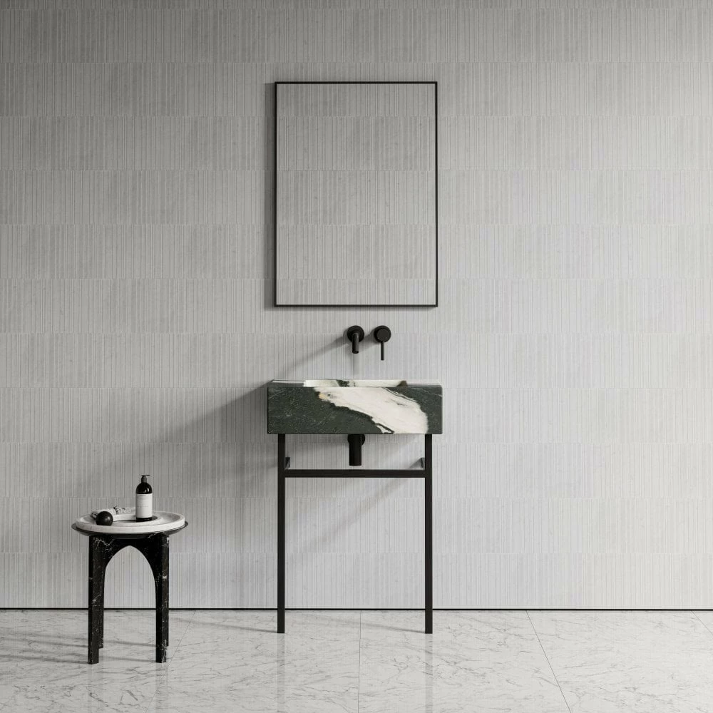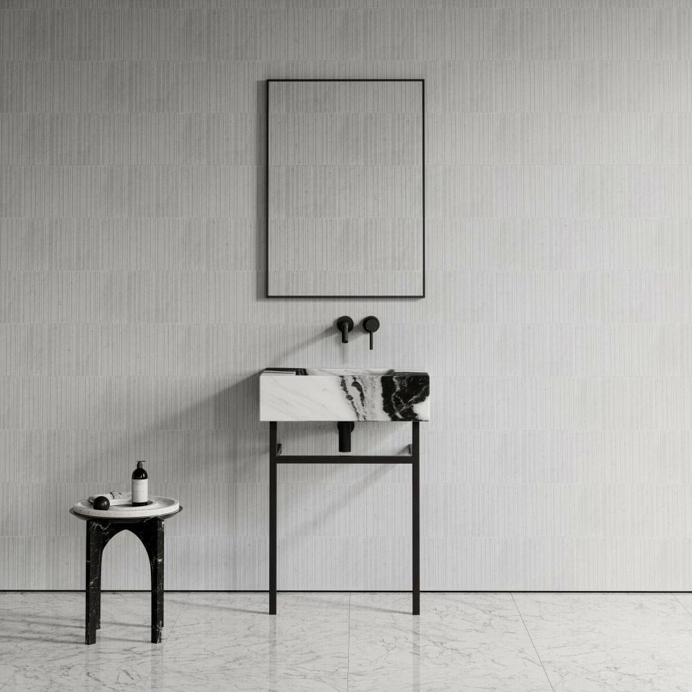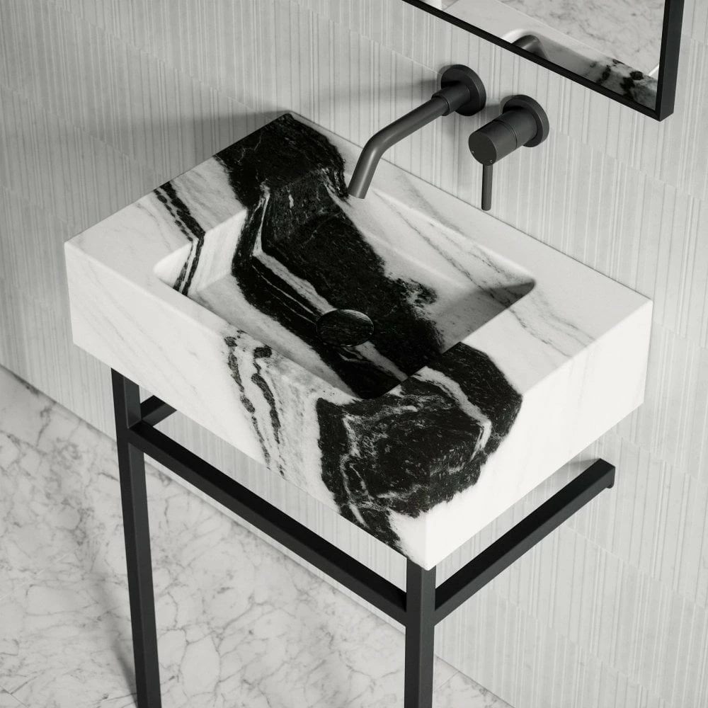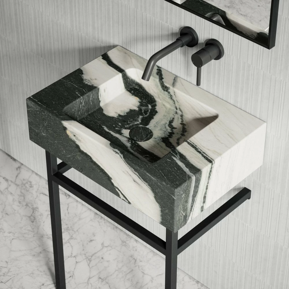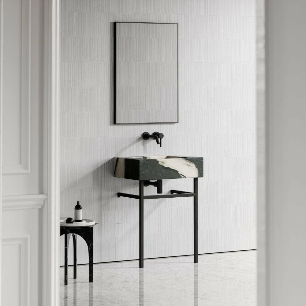 An indulgent expanse of solid marble creates this captivating basin floating serenely a-top its sleek black legs. Flaunting an effortless silhouette, the Vernante has a weightless appeal thanks to its slender stainless steel frame.