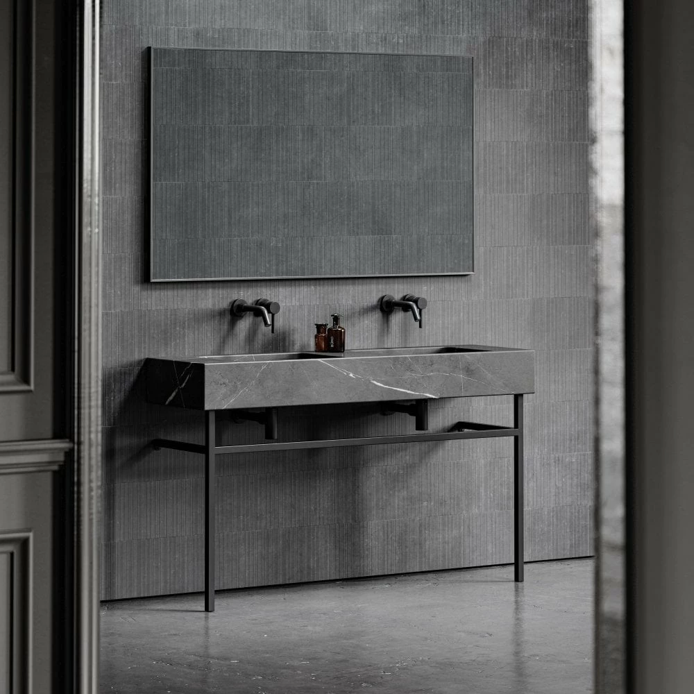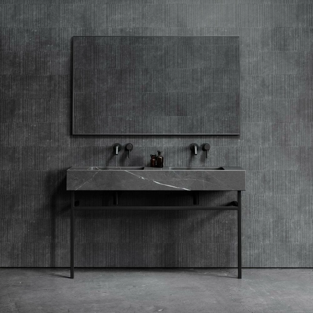 A consciously designed duo vanity, the charismatic double basins seamlessly sit a-top a weightless stainless steel structure. With a combination of smooth honed curves, the serene surface of marble, and soft satin legs; the double Vernante is a truly enriching piece which strives to incorporate stylish practical everyday use.
