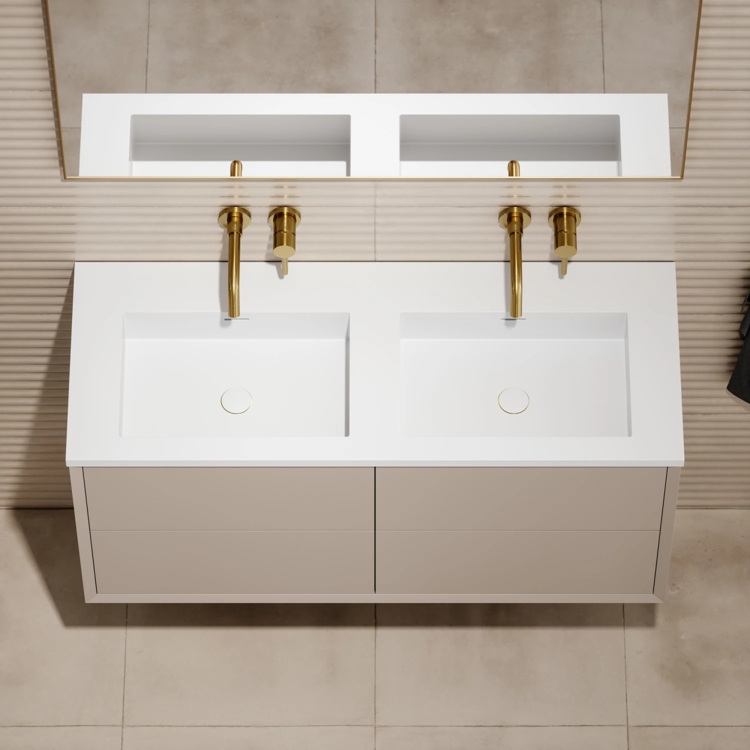 The stunning Volini Double Vanity Unit (with stone basin included) makes a striking appearance, effortlessly elevating any bathroom interior. Built in with Lusso’s signature double stone basins, ideal for couples and family bathrooms. This 1200mm wall hung vanity unit offers generous storage space perfect for uncluttered living, saving you space and maintaining a clean, minimal aesthetic.