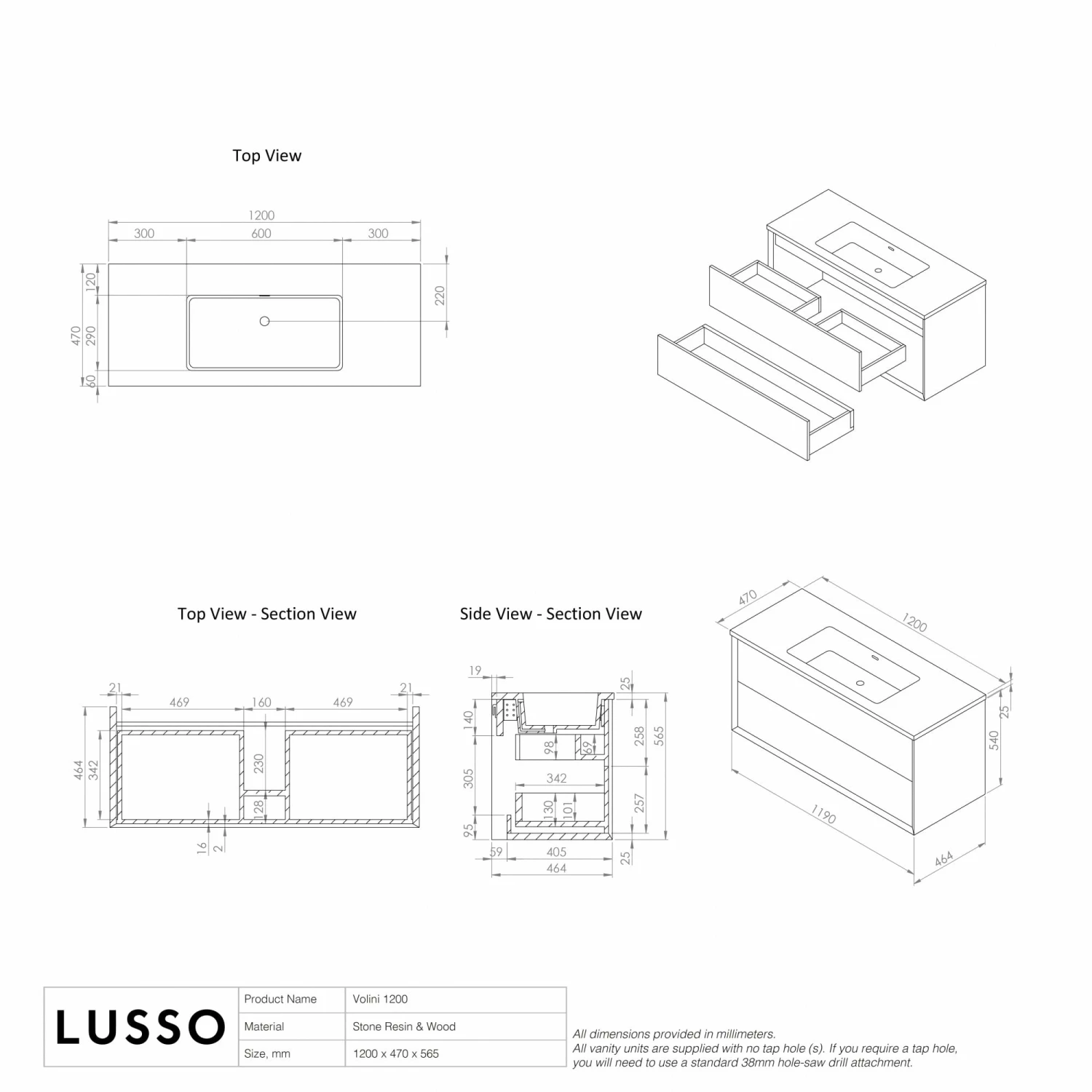 Supplied undrilled so that you have the option of using deck or wall mounted taps. Tap holes can be drilled using a standard 38mm hole-saw drill attachment.