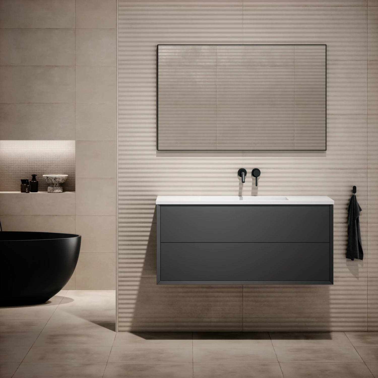 Elegant and striking, the Lusso Volini Matte Anthracite 1200mm Wall Hung Vanity Unit (with stone basin included) is a luxury addition to your modern interior. The contemporary dark hue will create a focal point in any space, adhering to the minimalistic aesthetic with the bevelled edge design and generous storage drawers. The Lusso Volini Matte Anthracite 1200mm Vanity Unit incorporates a classic Lusso basin, fusing effortless style and function to elevate even compact interiors.