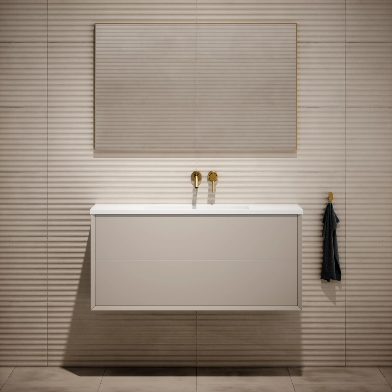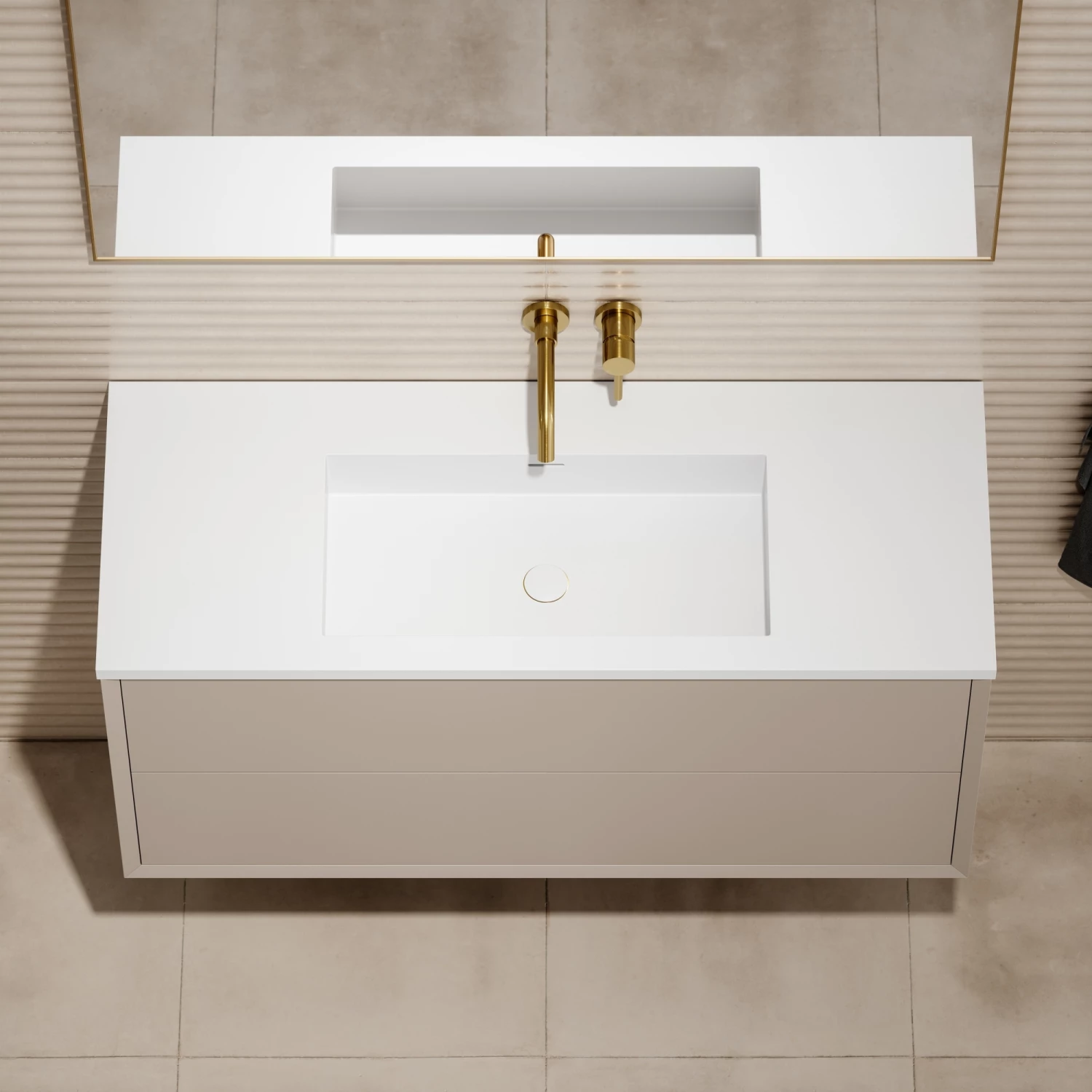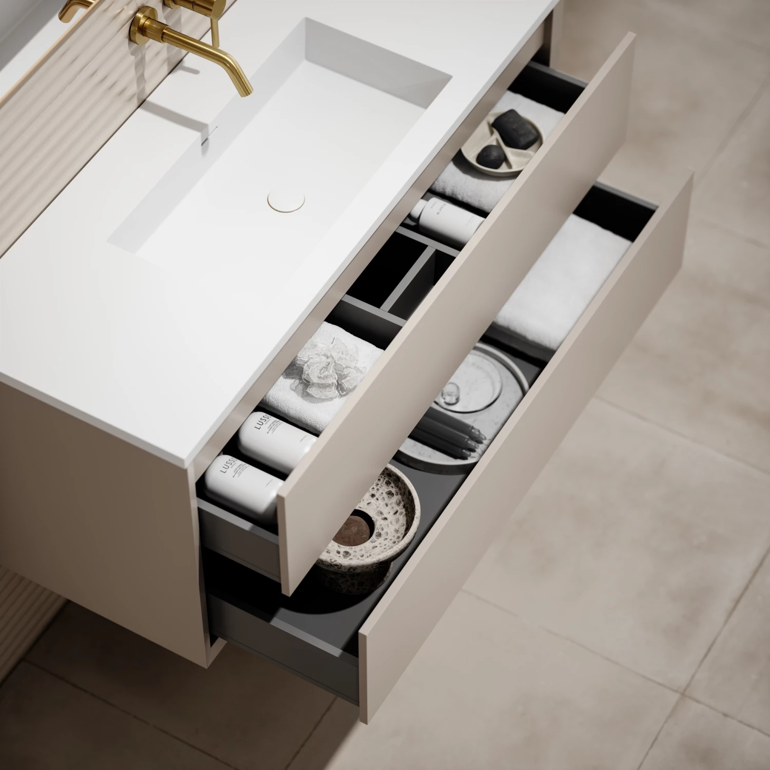 The Matte Cappuccino 1200mm Wall Hung Vanity Unit is manufactured to a very high standard, featuring a luxurious bevelled edge design, with drawers that are opened by a spring release blum drawer system. The basin is made from white matte composite stone.