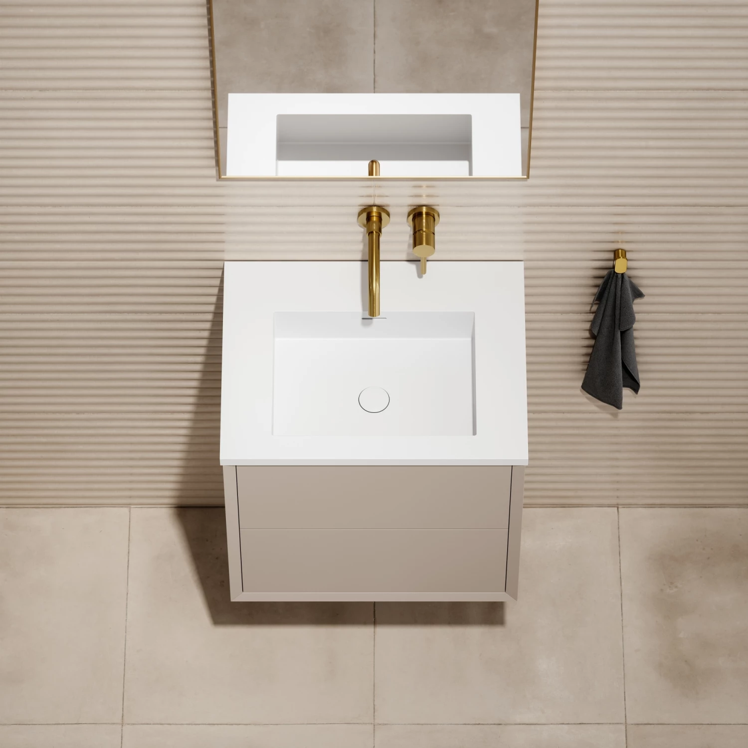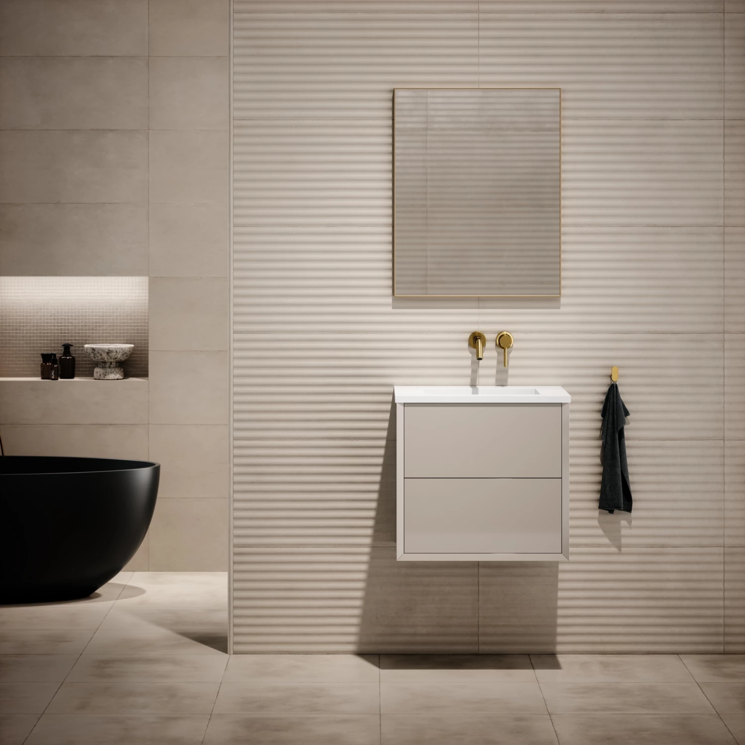 This Wall Hung Vanity Unit is manufactured to a very high standard featuring a luxurious bevelled edge design. The drawers are opened by a spring release blum drawer system and the basin is made from white matte composite stone.
